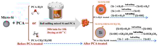 - Wang, S.; Cai, Z.; Wu, Q.; Li, Q.; Ahsan, Z.; Ma, Y.; Jing, H.; Song, G.; Yang, W.; Wen, C. Microstructural Characteristics and Electrochemical Performance of Core-Shell-Structured Si Powders Fabricated by Ball Milling with Different Process Control Agents. J. Mater. Eng. Perform. 2024, 33, 9084–9094. [Google Scholar] [CrossRef]