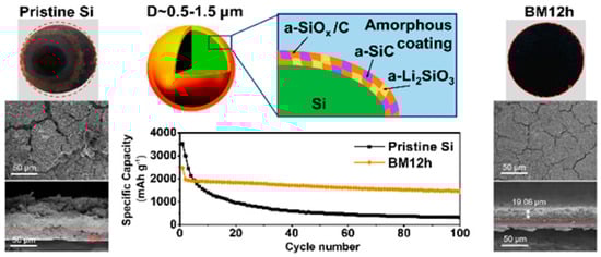- Yang, Y.; Qu, X.; Zhang, L.; Gao, M.; Liu, Y.; Pan, H. Reaction-ball-milling-driven surface coating strategy to suppress pulverization of microparticle Si anodes. ACS Appl. Mater. Interfaces 2018, 10, 20591–20598. [Google Scholar] [CrossRef] [PubMed]