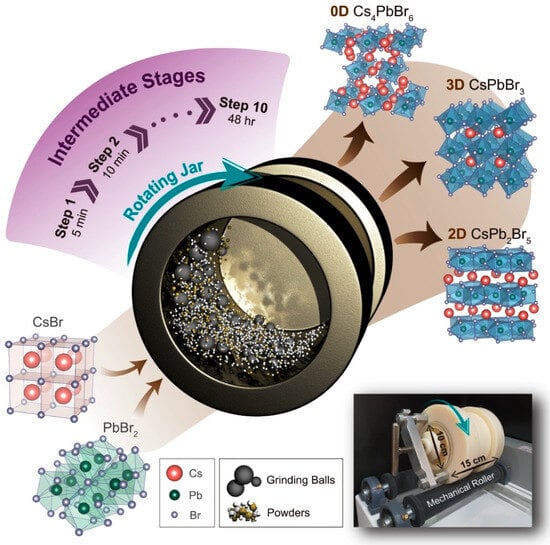 - Baek, K.-Y.; Lee, W.; Lee, J.; Kim, J.; Ahn, H.; Kim, J.I.; Kim, J.; Lim, H.; Shin, J.; Ko, Y.-J. Mechanochemistry-driven engineering of 0D/3D heterostructure for designing highly luminescent Cs–Pb–Br perovskites. Nat. Commun. 2022, 13, 4263. [Google Scholar] [CrossRef]