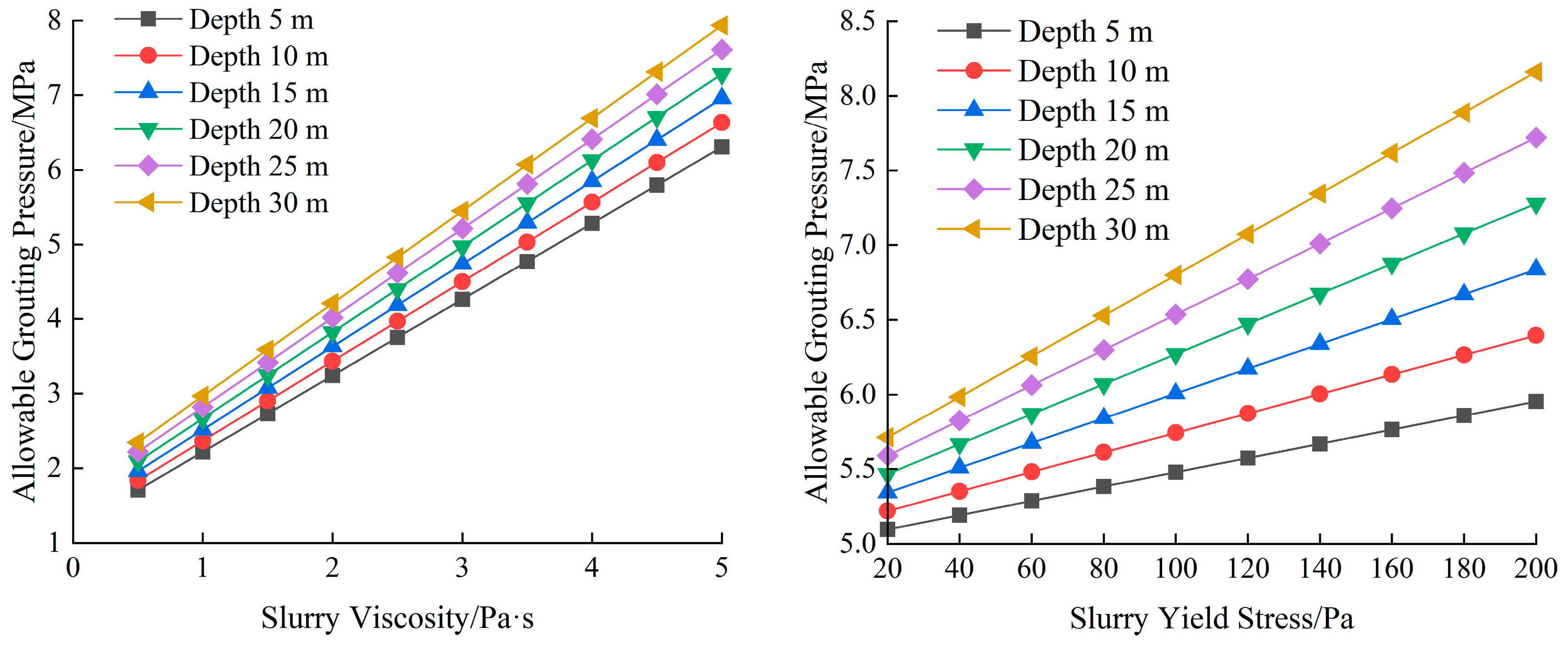 3.1. Influence of Slurry Characteristics on Allowable Grouting Pressure and Flow Pressure Loss Ratio