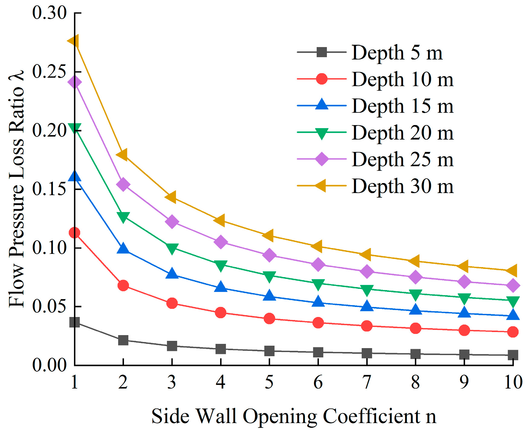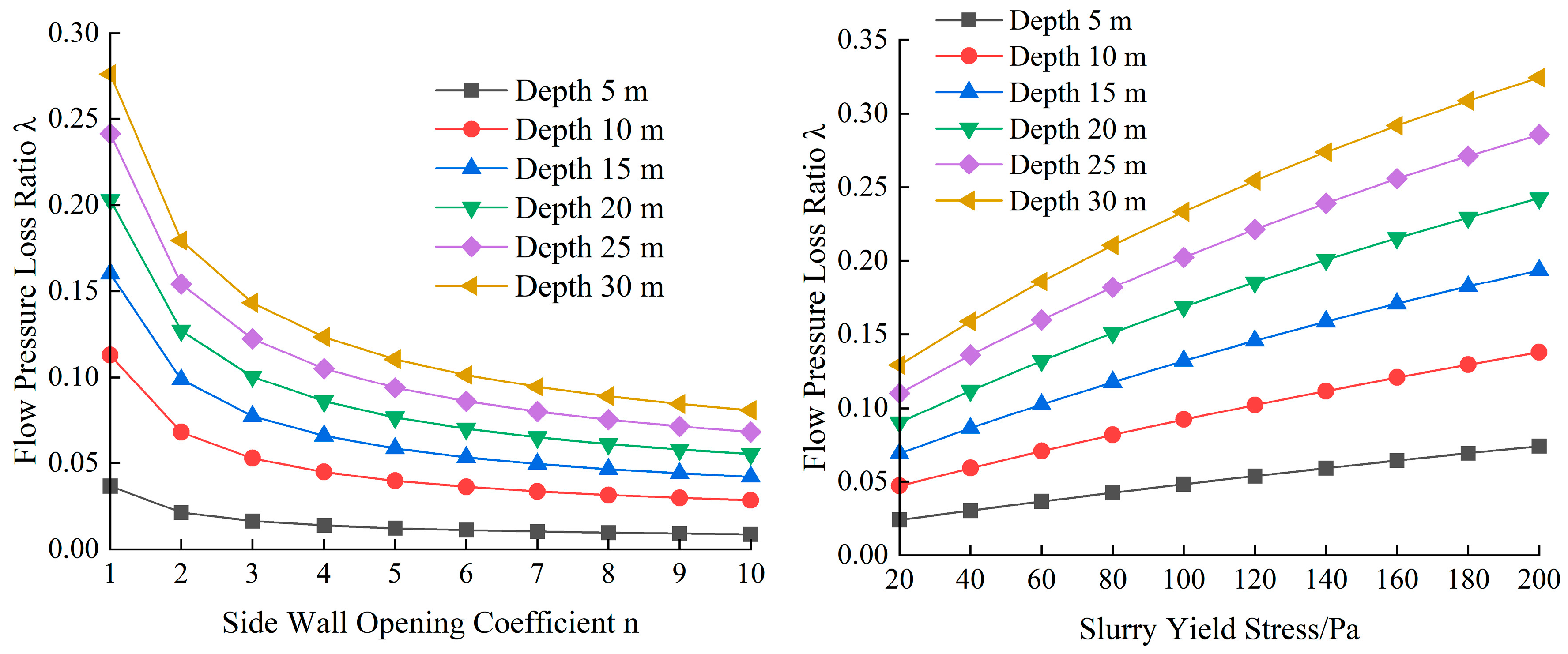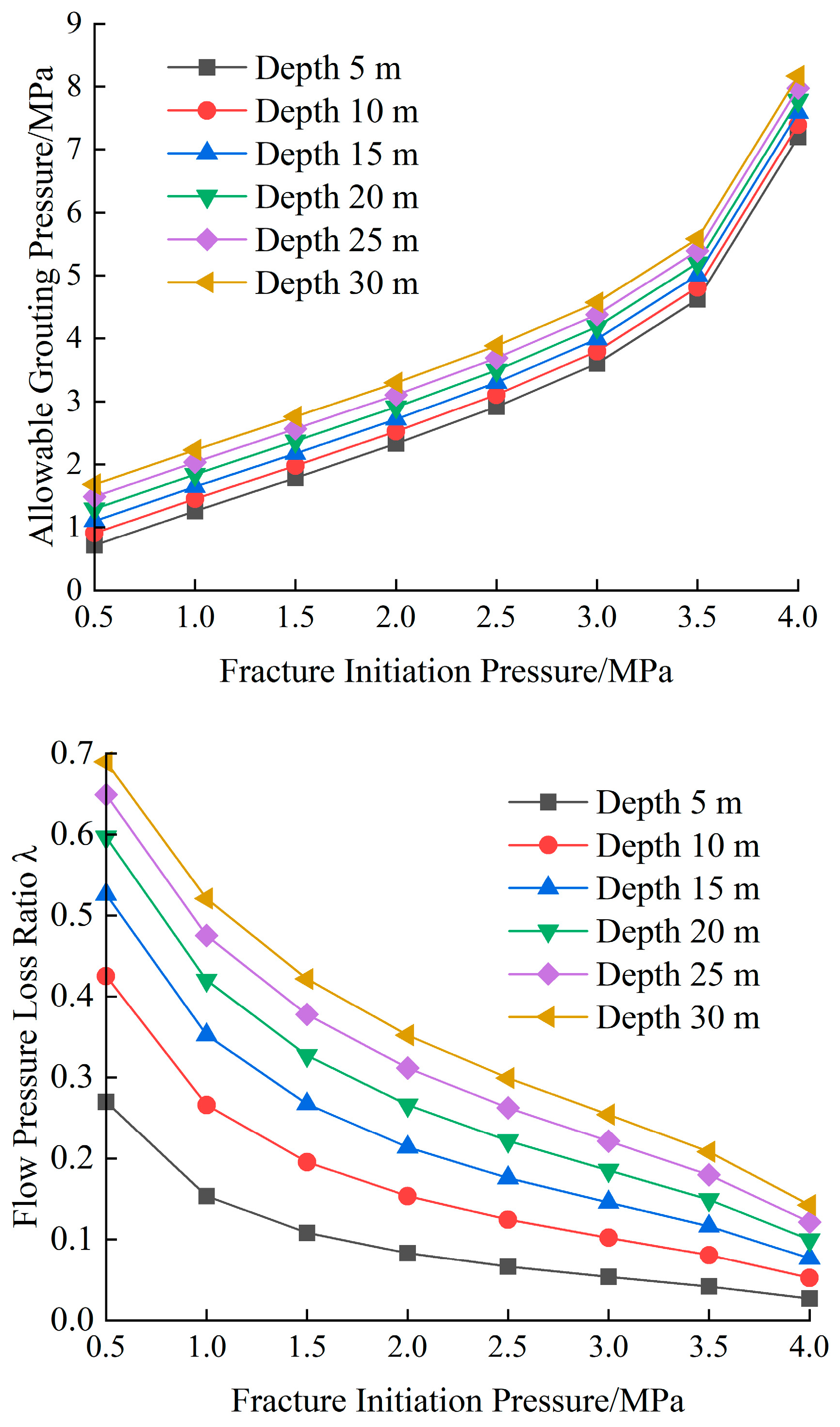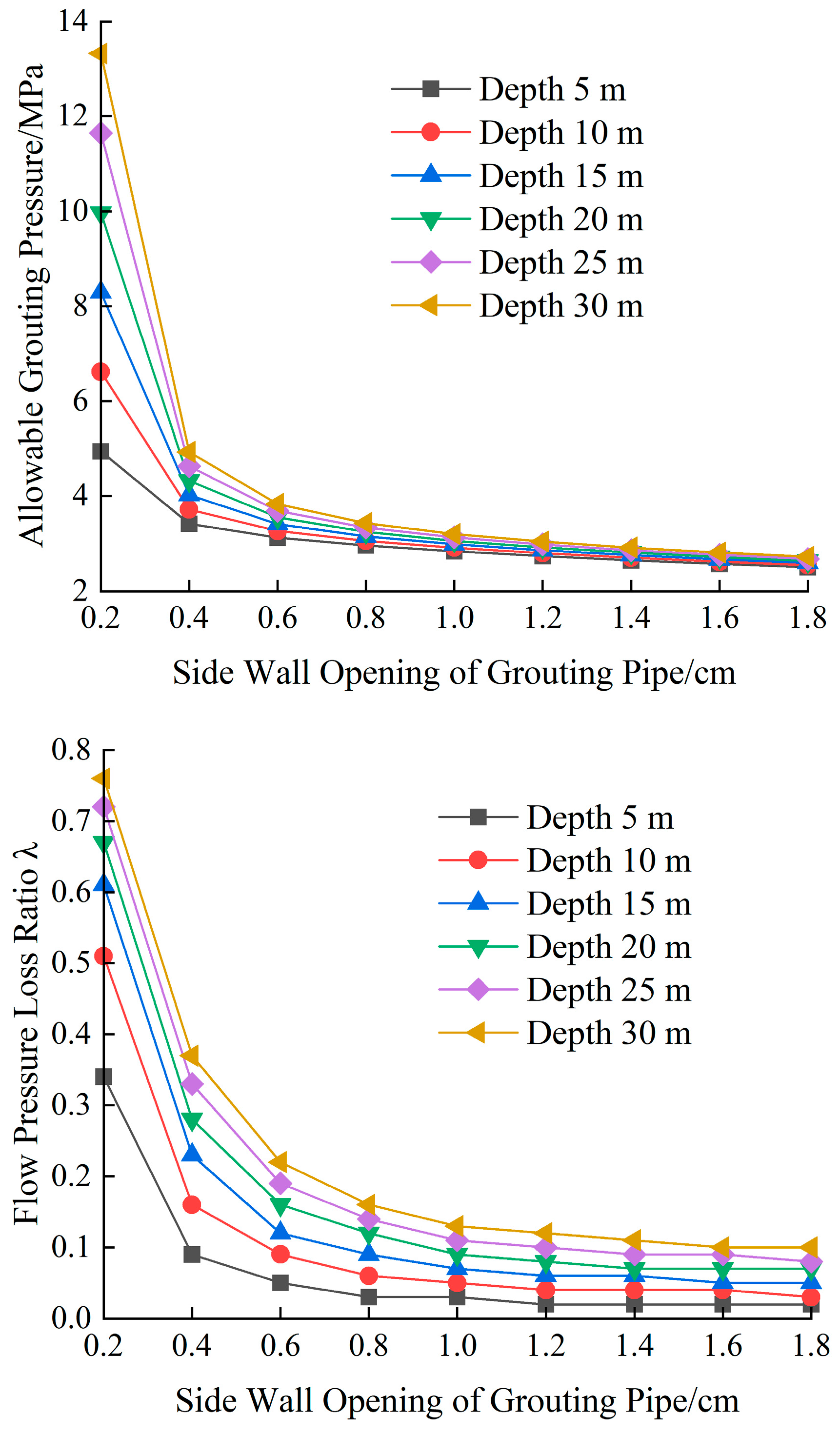 - Compared with yield stress, viscosity variation has a more significant effect on the allowable grouting pressure. The increase in the side wall opening of the grouting pipe causes the allowable grouting pressure to exhibit two-stage attenuation. The influence of the opening coefficient on the allowable grouting pressure becomes increasingly pronounced with increasing burial depth. Ignorance of the variation of the opening can result in a deviation in the allowable grouting pressure ranging from 4.6% to 21.2%. For every 20% increase in the surface consolidation depth, the allowable grouting pressure increases by 15% to 20%, while for every 20% increase in the fracture initiation pressure, it increases by 25% to 30%. The flow pressure loss ratio decreases with an increase in viscosity, increases with an increase in yield stress, and decreases significantly with an increase in the opening. To ensure the effectiveness of cyclic grouting, slurries with high viscosity and low yield stress may be adopted for deep grouting while simultaneously increasing the side wall opening of the grouting pipe.