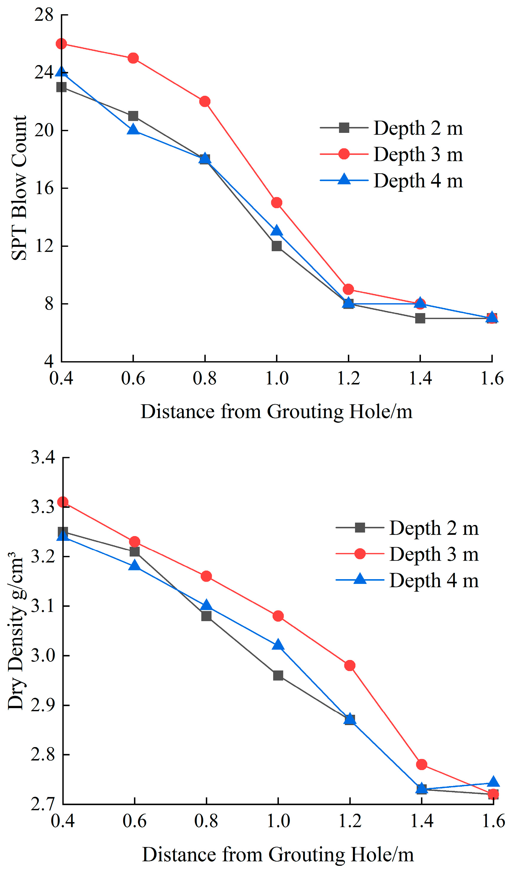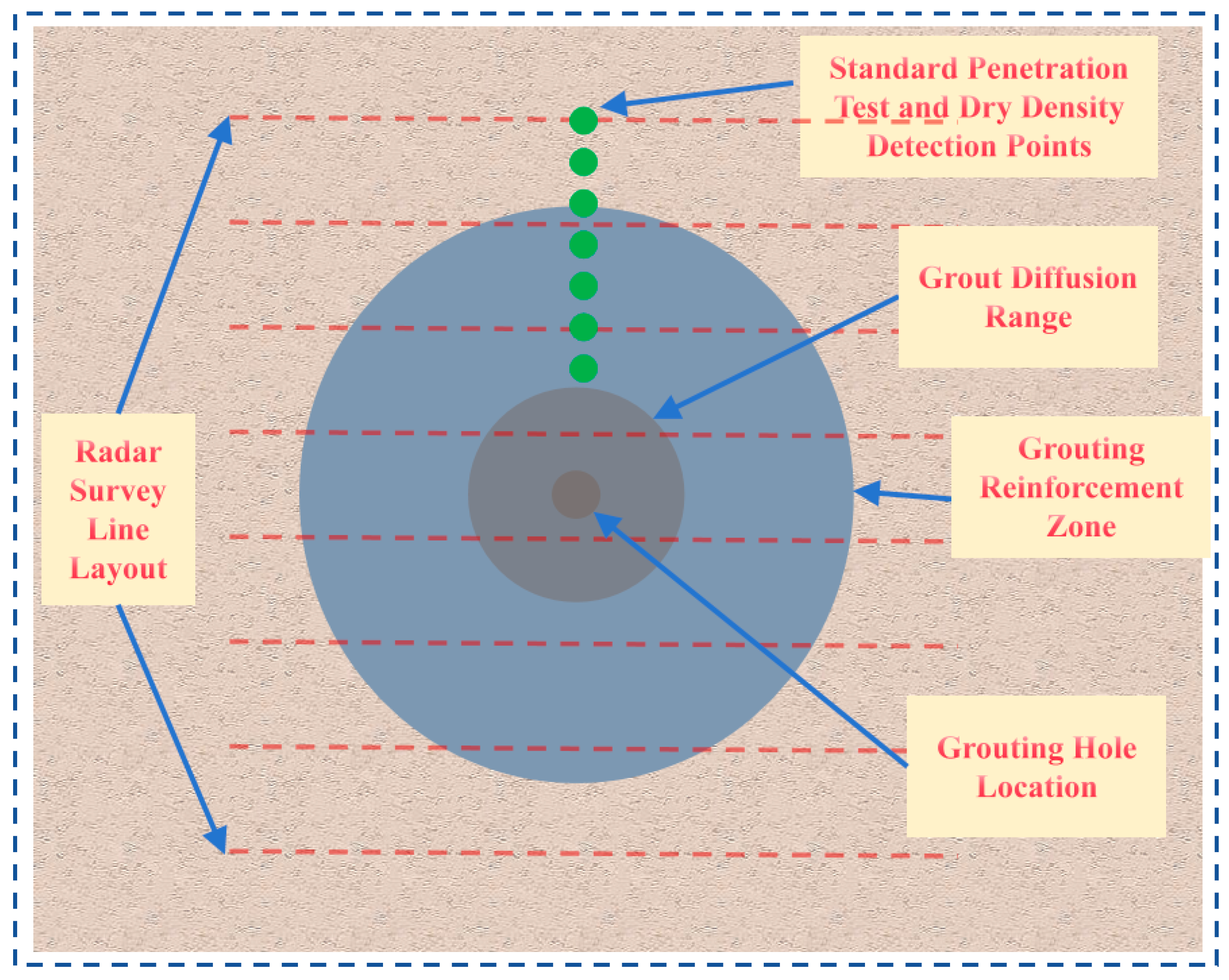 - Formation compression modulus parameters and slurry rheological parameters were obtained through confined compression tests and rheological tests, and comparative tests of layered grouting were conducted. The tests show that after 1.5 m surface consolidation pretreatment, the grouting pressure at the 4.5 m depth can be increased to 4.2 MPa with no slurry leakage on the ground. Within a 1.0 m radius, the core sample dry density is greater than 2.9 g/cm3, an increase of more than 8%; the standard penetration blow count is greater than 12, an increase of more than 30%; and radar analysis indicates uniform grouting reinforcement. Comprehensive results show that this grouting process greatly improves the bearable grouting pressure in the near-surface area and effectively improves the uniformity of grouting reinforcement.