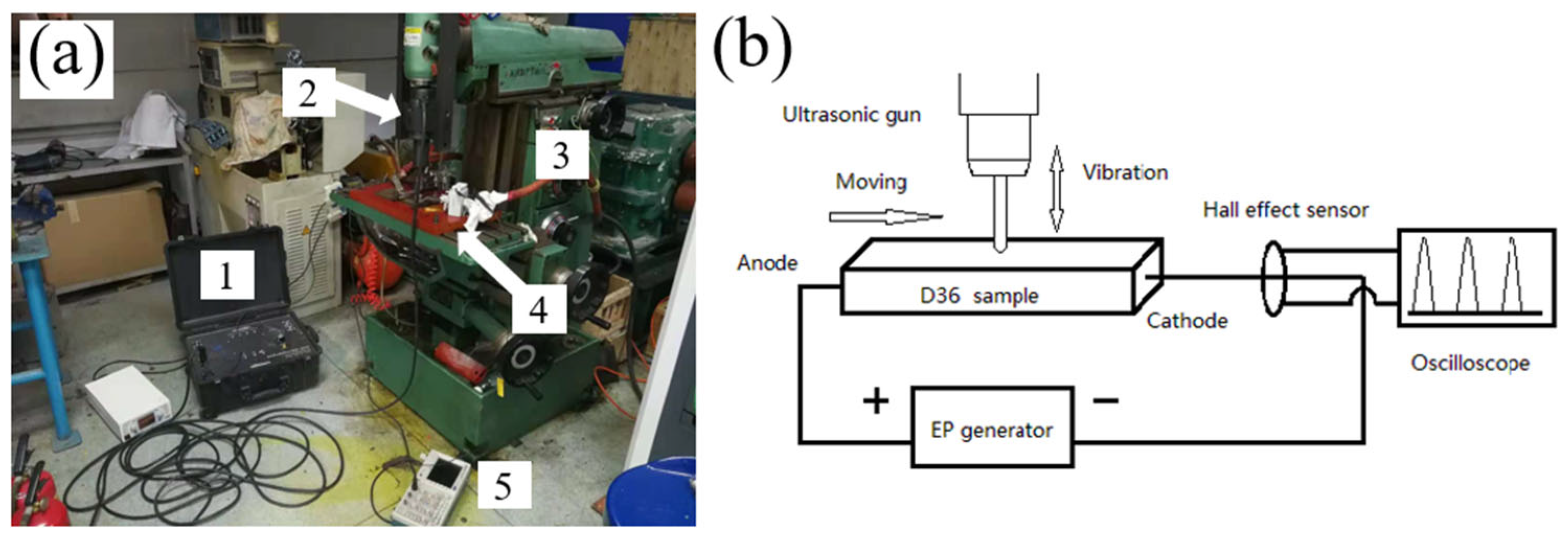 - Liu, T.; Li, X.P.; Tang, G.Y.; Song, G.L. Effect of ultrasonic impact treatment assisted with high energy electropulsing on microstructure of D36 carbon steel. J. Mater. Res. 2016, 31, 3956–3967. [Google Scholar] [CrossRef]