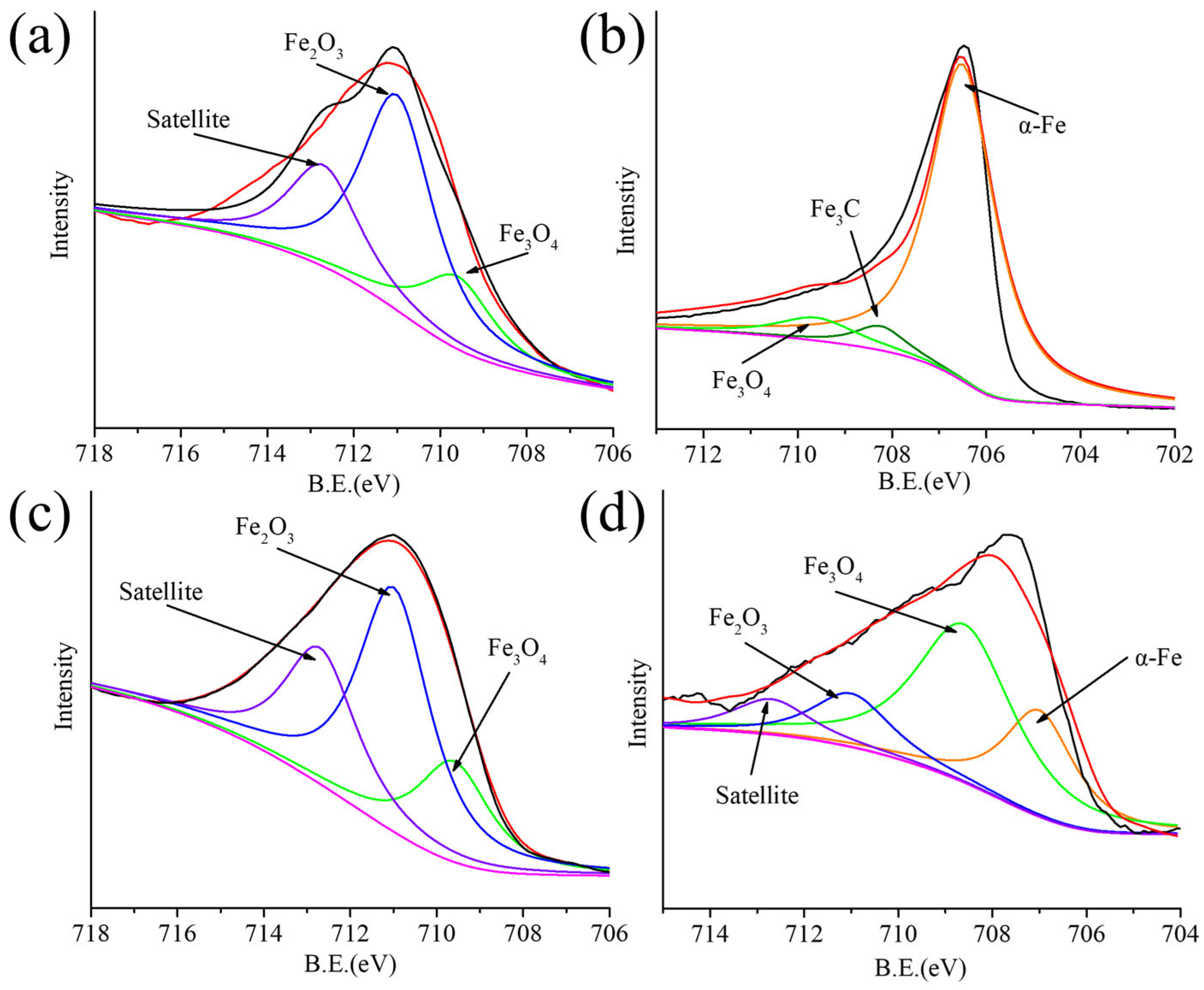 | Compounds or Phase | Peak Position (Bonding Energy) Fe 2p3/2 (±0.4 eV) | Full Widths at Half-Maximum Fe 2p3/2 (±0.2 eV) |