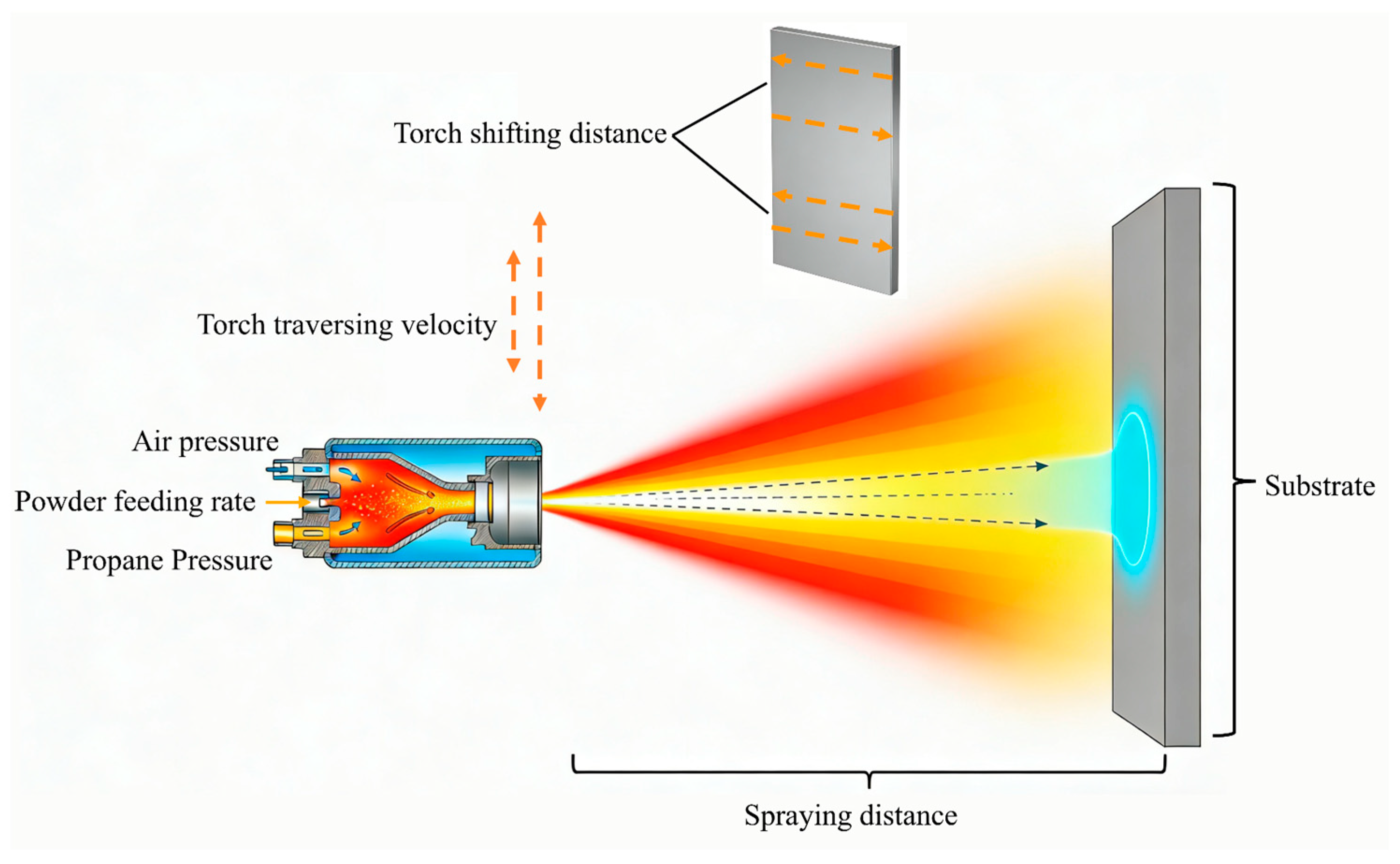 - Gao, X.; Li, C.; Zhang, D.; Gao, H.; Han, X. Numerical analysis of the activated combustion high-velocity air-fuel (AC-HVAF) thermal spray process: A survey on the parameters of operation and nozzle geometry. Surf. Coat. Technol. 2021, 405, 126588. [Google Scholar] [CrossRef]