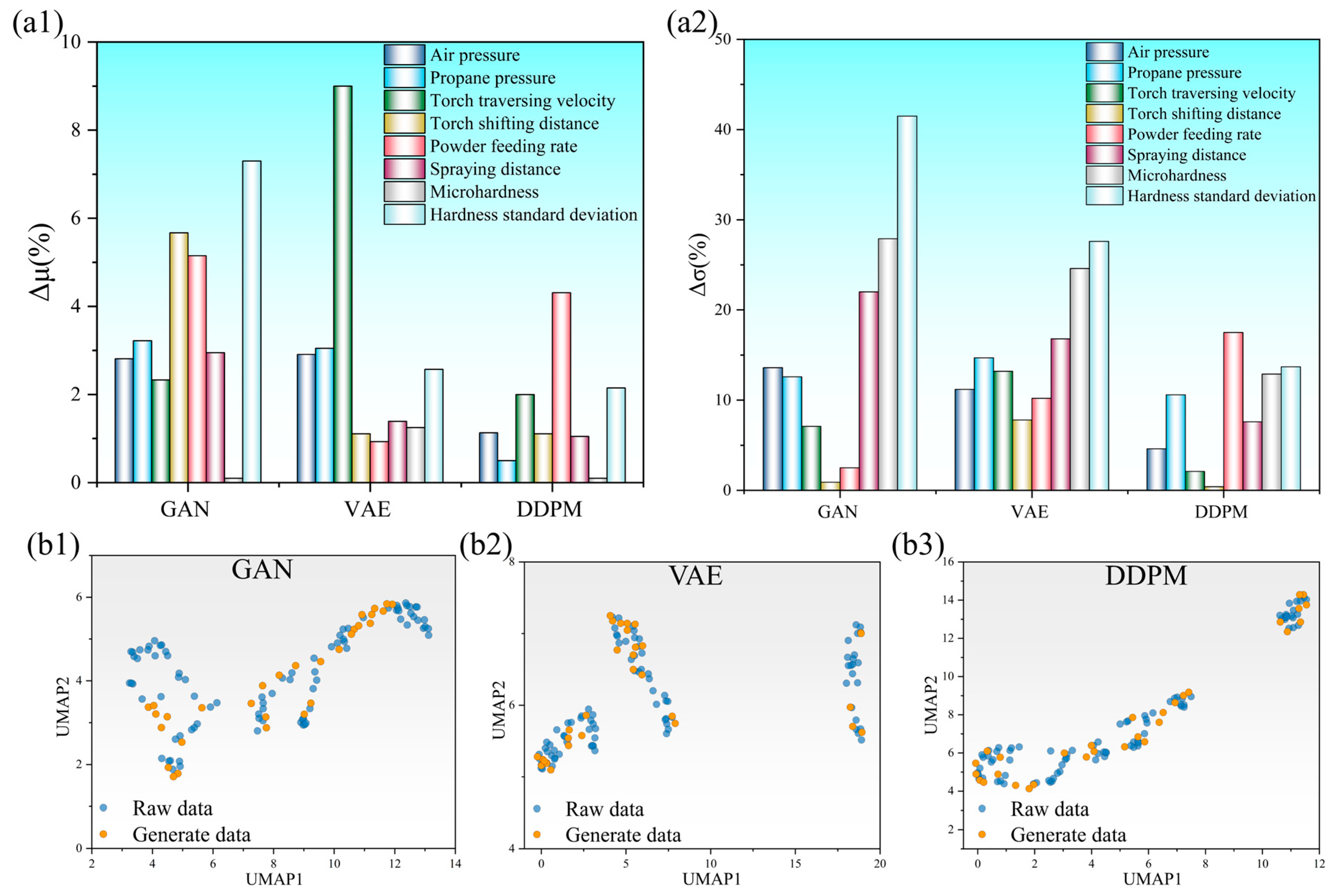 - A comprehensive comparison of three generative models—GAN, VAE, and DDPM—demonstrated that DDPM exhibits superior statistical fidelity and distribution consistency with respect to real HVAF process data, thereby effectively mitigating the limitations imposed by data scarcity. Among ten representative regression algorithms, GBR delivered the highest predictive accuracy and robustness. Furthermore, augmenting the training dataset with 10% DDPM-generated samples led to a further improvement in both prediction accuracy and model generalization.