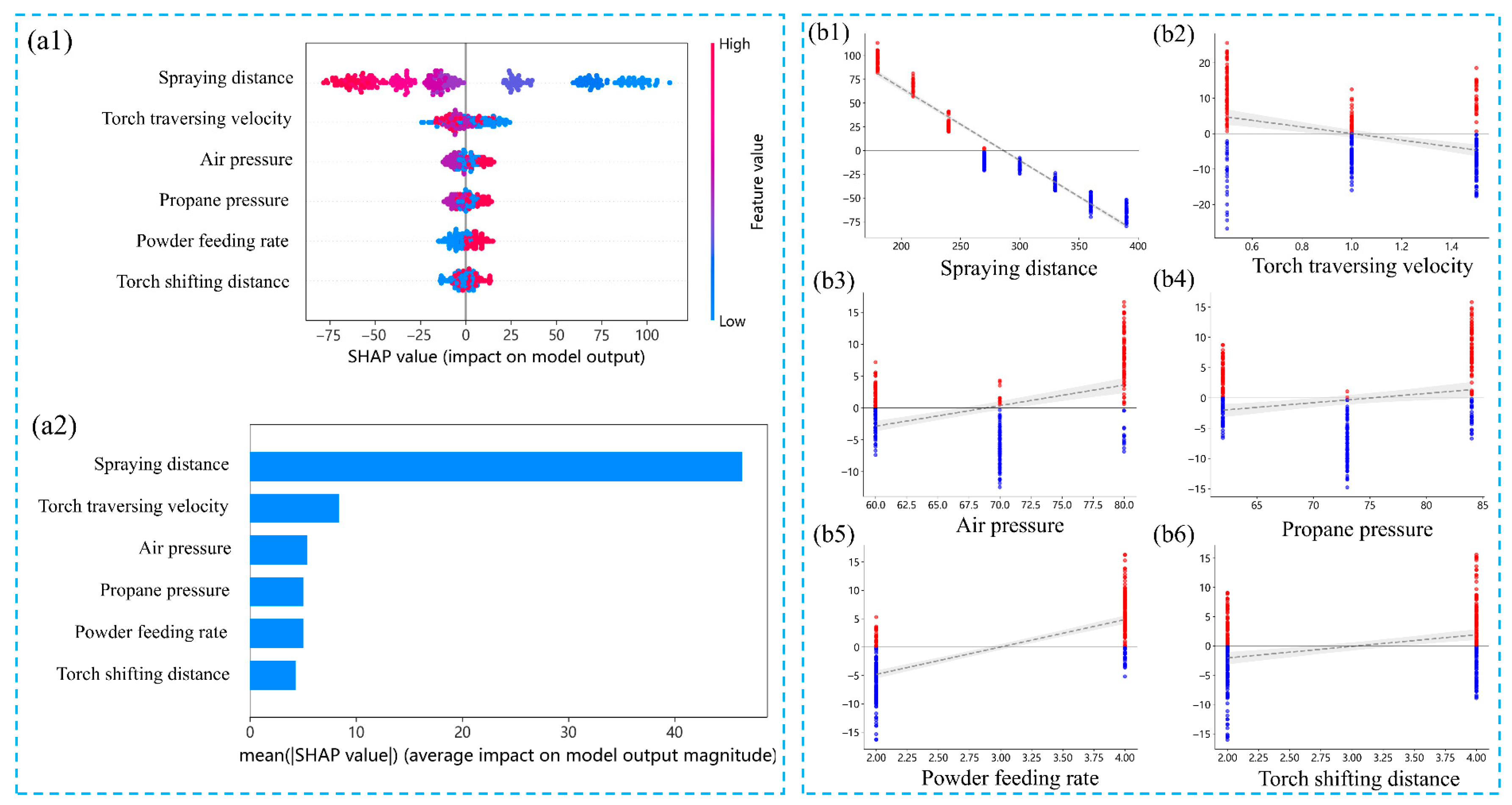 - SHAP-based feature importance and interaction analyses quantitatively revealed that spraying distance plays a dominant governing role in determining coating microhardness, substantially outweighing the contributions of other process parameters. In contrast, hardness uniformity is jointly regulated by the coupled effects of torch traversing velocity, torch shifting distance, and powder feeding rate. These findings not only enhance the transparency and interpretability of the predictive models but also provide mechanism-informed guidance directly applicable to engineering-oriented process optimization.