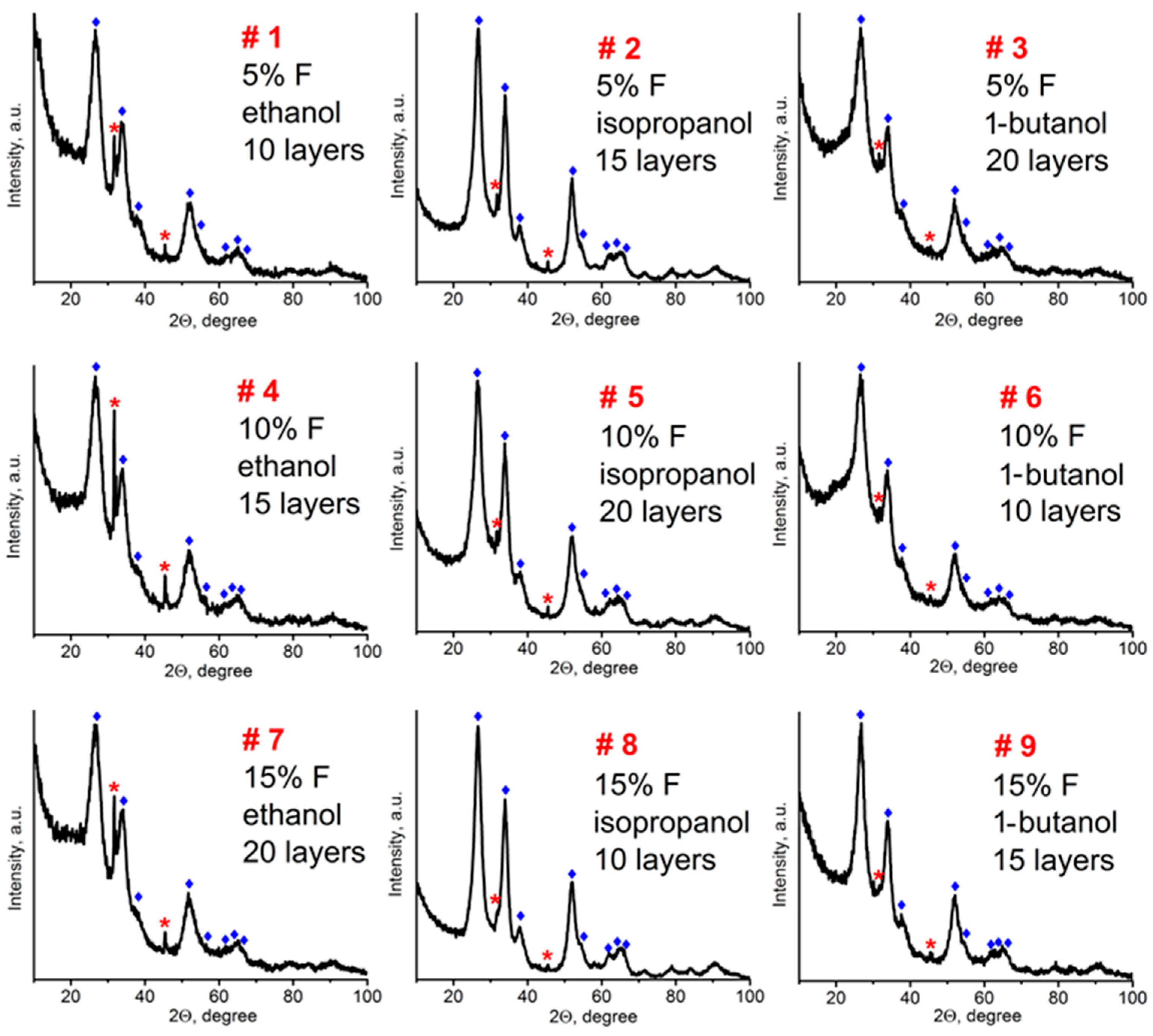 - Shi, X.H.; Xu, K.J. Properties of fluorine-doped tin oxide films prepared by an improved sol-gel process. Mater. Sci. Semicond. Process. 2017, 58, 1–7. [Google Scholar] [CrossRef]