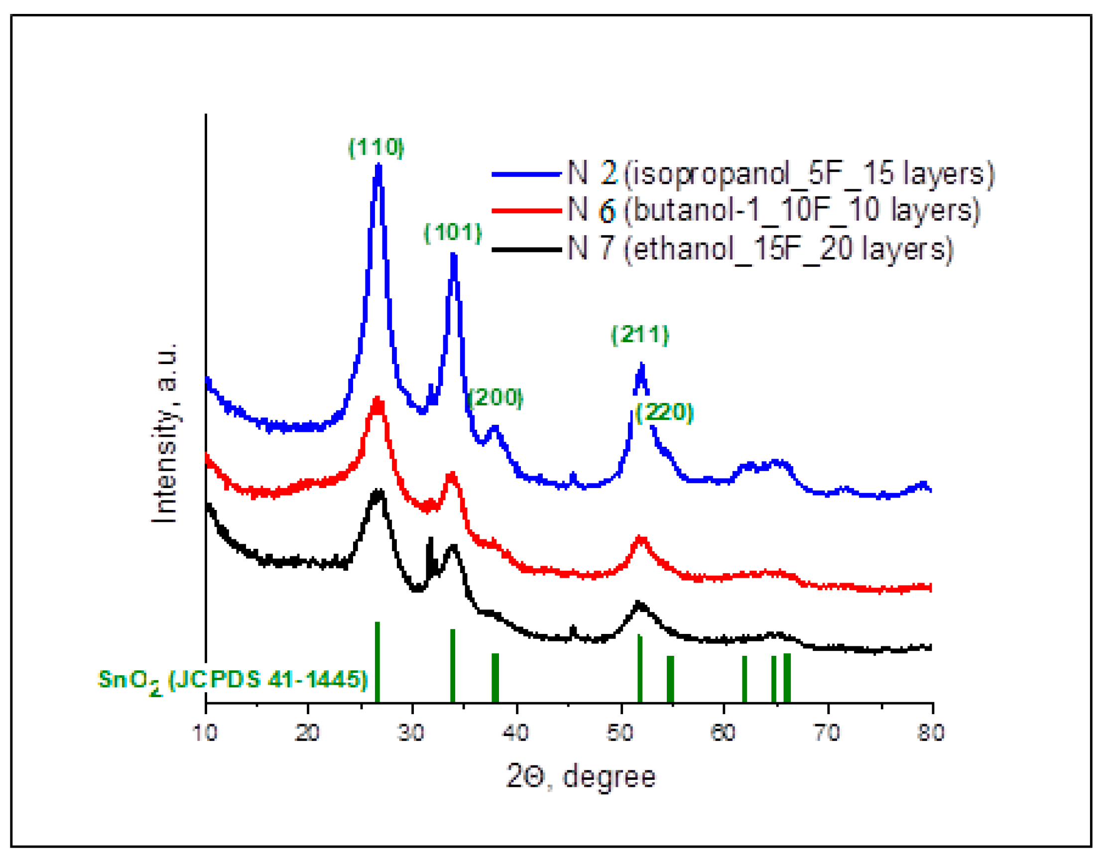 - Belousov, S.A.; Nosov, A.A.; Men’shikova, T.G.; Rembesa, S.I. Electrophysical properties of metal oxide films SnO2 manufactured by sol-gel technology. Vestn. VGTU 2016, 2. Available online: https://cyberleninka.ru/article/n/elektrofizicheskie-svoystva-metallooksidnyh-plenok-sno2-izgotovlennyh-po-zol-gel-tehnologii/viewer (accessed on 2 February 2026). (In Russian)