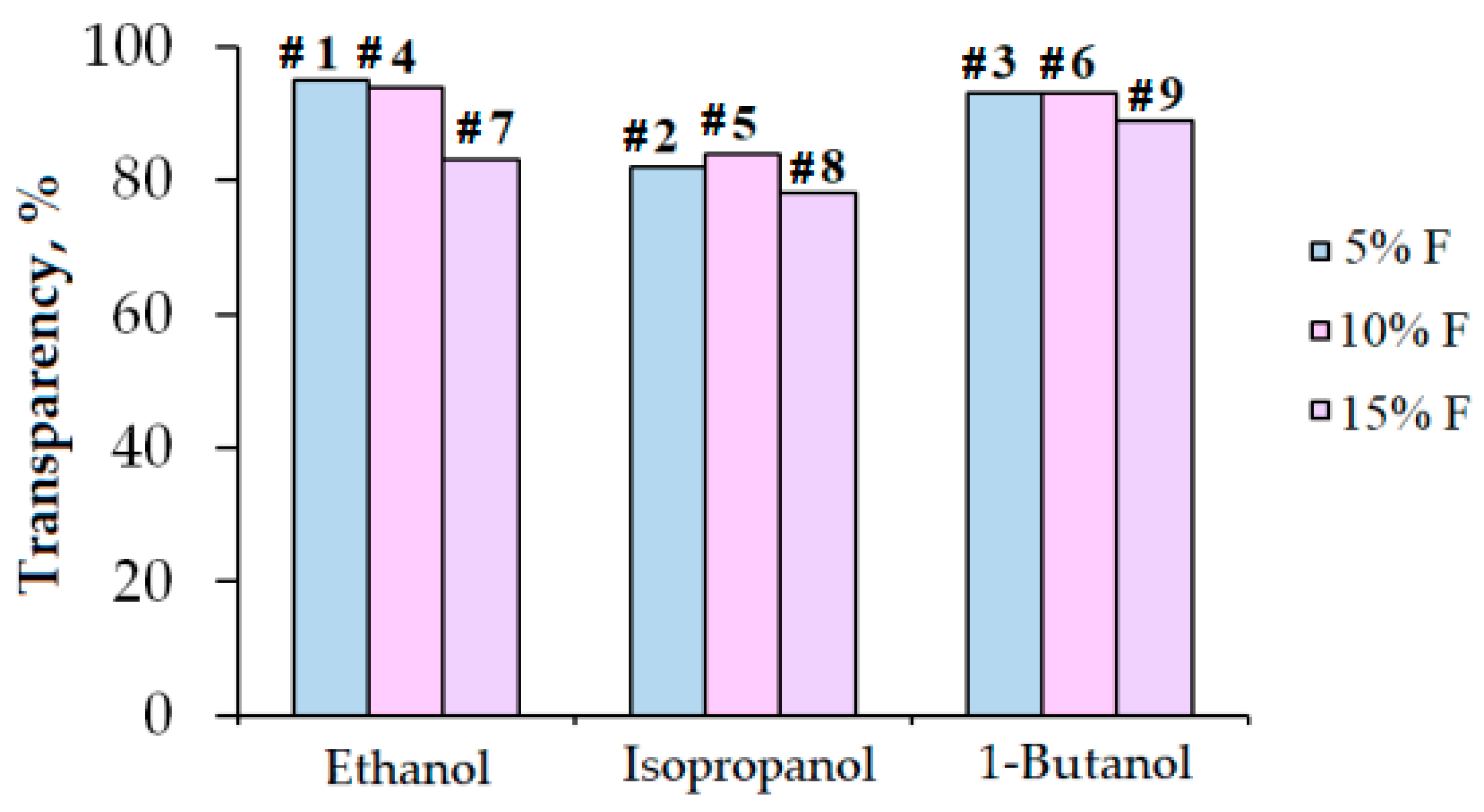 | Factor B: Fluorine Amount, at. % | Factor A: Organic Solvent | ||