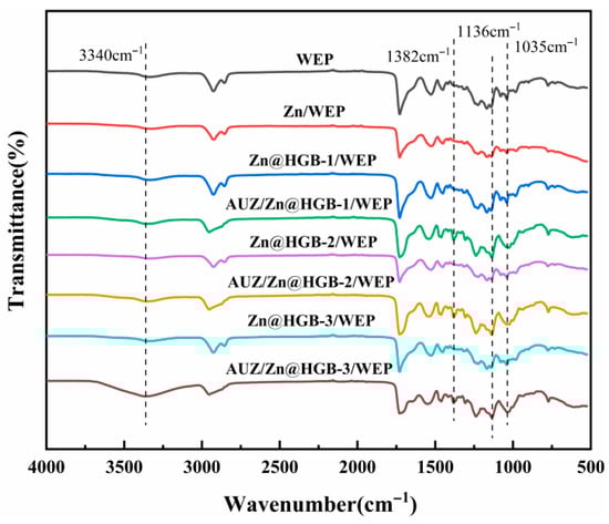 Figure 2 presents the Fourier-transform infrared (FT-IR) spectra of the waterborne composite coatings, with the baseline WEP spectrum (black line) exhibiting characteristic vibrational signatures of its molecular structure. The spectrum is dominated by the hydrophilic hydroxyl group stretching vibration at 3340 cm−1, along with fingerprints of the epoxy resin backbone: symmetric and asymmetric C-H stretches of aliphatic groups at 2926 and 2856 cm−1; aromatic -C=C- bending vibrations at 1728, 1528, and 1451 cm−1; bending vibrations of the isopropylidene group -C(CH3)2- at 1317 cm−1 coupled with the asymmetric stretching of the C-O-C ether linkage at 1226 cm−1. The distinct absorption bands in the 1200–1000 cm−1 region are assigned to C-O-C stretching vibrations of the epoxy rings, while the bending vibrations of the epoxy groups themselves appear between 950–800 cm−1. Deformation vibrations of the epoxy rings are observed in the 870–750 cm−1 range [26]. Compared to the baseline, the matching coating system (e.g., green trace) exhibits a marked increase in the intensity of the hydroxyl band at 3340 cm−1, which is attributed to the increased mass fraction of WEP in the topcoat formulation, which introduces a greater number of hydrophilic hydroxyl groups into the system. This interpretation is further supported by the enhanced intensity of characteristic epoxy signals at 1382, 1136, and 1035 cm−1, consistent with the elevated WEP content in the final coating structure.