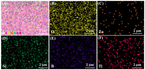 EDS-mapping diagram of AUZ/Zn@HGB-2/WEP composite coating: (A) selected elements, (B) O, (C) Zn, (D) Si, (E) B, (F) Ti.