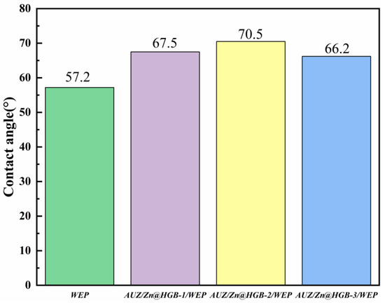 The surface wettability of the composite coatings was quantitatively assessed through water contact angle (CA) measurements (Figure 6). The pristine WEP exhibits a CA of 57.2°, indicating pronounced hydrophilic character. All modified coatings maintained CAs below 90°, remaining within the hydrophilic range, yet a marked increase in hydrophobicity was observed. This enhancement is attributed to the incorporation of hydrophobic constituents, specifically the urushiol–titanium polymer and zirconium phosphate (ZrP). Among the modified formulations, the coating with 2 wt% HGB addition demonstrated the most significant improvement, achieving a CA of 70.5°. This substantial increase suggests that HGB, functioning as an oleophilic-hydrophobic material, contributes effectively to hindering water penetration by altering the surface energy and microstructure of the composite. The enhanced hydrophobicity contributes to a more effective barrier against corrosive species, supporting the overall improvement in anticorrosion performance.