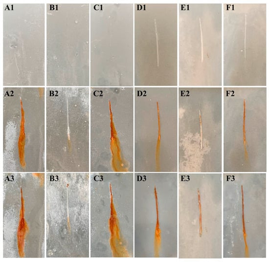 Optical photographs of the zinc-rich primer coating and the modified coating after neutral salt spray tests at different times: (A) Zn@HGB-1/WEP; (B) Zn@HGB-2/WEP; (C) Zn@HGB-3/WEP; (D) AUZ/Zn@HGB-1/WEP; (E) AUZ/Zn@HGB-2/WEP; (F) AUZ/Zn@HGB-3/WEP, where (1) 0 h, (2) 360 h, (3) 720 h.