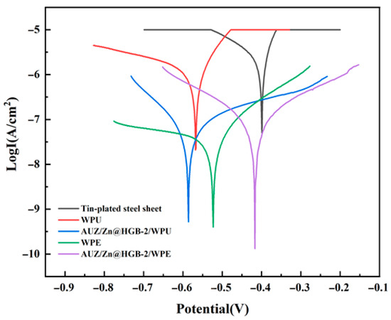 Building upon the confirmed efficacy of the proposed methodology in significantly enhancing the anti-corrosion performance of WEP systems, we further extended its application to assess universality across aqueous WPU and WPE systems [36]. As illustrated by the Tafel polarization curves in Figure 10 and the corresponding fitting data in Table 4, both unmodified WPU and WPE coatings reduced the Icor by one to two orders of magnitude relative to the bare tin-plated steel substrate. Given that a lower Icor generally corresponds to improved corrosion resistance, this indicates that the base polymers themselves afford a basic degree of protection. More significantly, after modification with the AUZ/Zn@HGB composite system, the Icor further decreased by an additional one to two orders of magnitude. Notably, the AUZ/Zn@HGB-2/WPE system exhibited the most pronounced improvement, with Icor suppressed by two full orders of magnitude. These results strongly demonstrate that the integrated coating system—composed of an HGB-modified zinc-rich primer and an AUZ-modified topcoat—markedly enhances corrosion protection. The underlying mechanism can be attributed to the synergistic combination of a dense barrier effect, imparted by zirconium phosphate (ZrP) and urushiol–titanium polymer (UTP) within the AUZ component, together with mitigated internal stress and delayed permeation of corrosive species facilitated by HGB and zinc powder [37]. These findings collectively verify the broad applicability of the proposed modification strategy beyond WEP to other aqueous coating systems.