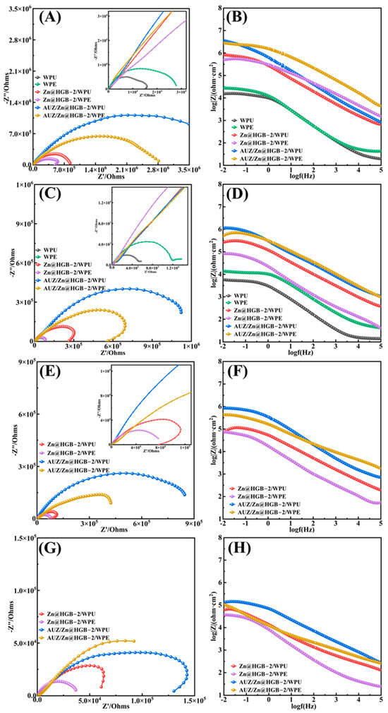 Nyquist plots and Bode plots of waterborne epoxy composite coatings at: 1 h (A,B), 2 d (C,D), 10 d (E,F), and 25 d (G,H).