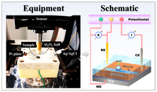 Electrochemical corrosion performance was evaluated in accordance with the ASTM G59-97 standard. Tests were conducted using a Gamry Reference 600+ electrochemical workstation at room temperature (Gamry Instruments, Warminster, PA, USA), with a 3.5 wt% NaCl solution serving as the electrolyte. A standard three-electrode cell configuration was employed: the TC4 substrate, HVOF coating, and Duplex coating served as the working electrodes, a platinum plate as the counter electrode, and a KCl-saturated Ag/AgCl electrode as the reference electrode. Prior to testing, samples were immersed in the electrolyte for 2 h to allow the open circuit potential (OCP) to stabilize, during which the OCP was continuously monitored. Electrochemical impedance spectroscopy (EIS) measurements were then performed over a frequency range of 105 to 10−2 Hz, applying a sinusoidal amplitude of 10 mV. Subsequently, potentiodynamic polarization (PDP) scans were carried out, scanning from −0.5 V to +1.0 V relative to the OCP at a constant sweep rate of 0.5 mV/s. Electrochemical corrosion tests were performed in triplicate for each sample group to ensure data reliability. Figure 2 shows the equipment and schematic diagram of the tribocorrosion test apparatus.