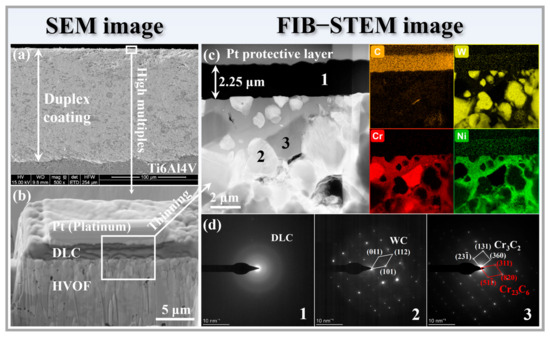 It is observed from Figure 5a that the HVOF coating and the TC4 substrate are in close contact without obvious gaps. High-velocity particles impact the soft TC4 substrate and produce plastic deformation during the thermal spraying process. Therefore, the HVOF coating exhibits good contiguous mechanical contact with the substrate. From Figure 5c (partial enlargement and thinning of Figure 5b), it can be clearly seen that the thickness of the DLC film is about 2.25 μm, accompanied by a dense and uniform structure. The EDS mappings of C, W, Cr, and Ni are also displayed in Figure 5c. The C gathered on the top represents the DLC film, and the evenly dispersed C at the bottom comes from WC-20Cr3C2-7Ni. It should be pointed out that the missing area of the W element corresponds to the enriched area of the Cr elements. Furthermore, in conjunction with the SAED results (Figure 5d), it can be demonstrated that the HVOF coating consists mainly of tungsten carbide and chromium carbide phases. Unlike this, the DLC film exhibits a typical amorphous structure, which aligns with the XRD results.