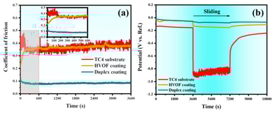 (a) COF and (b) OCP of the TC4 substrate, HVOF, and Duplex coatings during the tribocorrosion tests.