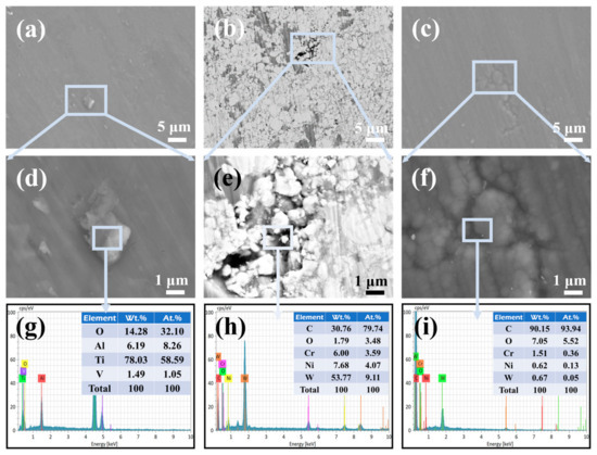 The surface morphologies of the TC4 substrate, HVOF coating, and Duplex coating after corrosion are displayed in Figure 11. As seen in Figure 11a, tiny irregular particles were found on the TC4 substrate after electrochemical corrosion. The EDS probing of the enlarged area (Figure 11d,g) found that the main elements of the particles comprised Ti and O. It means that the corrosion product formed by the TC4 substrate is mainly TiO2. The high-stability of the TiO2 film provides shielding for the TC4 substrate, which gives it an excellent corrosion resistance under static conditions [28].