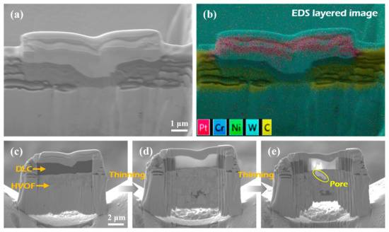 In addition, no obvious corrosion products were observed on the surface of the HVOF coating (Figure 11b,e); however, microcracks and defects were found after corrosion. It is caused by the intrinsic characteristics of thermal spraying [29]. The EDS result (Figure 11h) shows that the oxygen content is very small at the crack. According to reports [28,30], the electrochemical corrosion performance of the HVOF coating is more controlled by the pores and defects in the coating. It is worth noting that the defects similar to the ones seen on the HVOF coating were also found on the corroded Duplex coating (Figure 11c). The difference is that the defect is evenly filled with dark material in the Duplex coating (Figure 11f). The EDS (Figure 11i) inspection revealed that the main element at the crack was carbon element. To further elucidate the superior corrosion resistance of the Duplex coating relative to the HVOF coating, the post-corrosion cross-sectional morphology of the Duplex coating was examined using a combined focused ion beam and scanning electron microscopy (FIB-SEM) system. Figure 12a,b shows FIB selection area and EDS layered image, respectively.