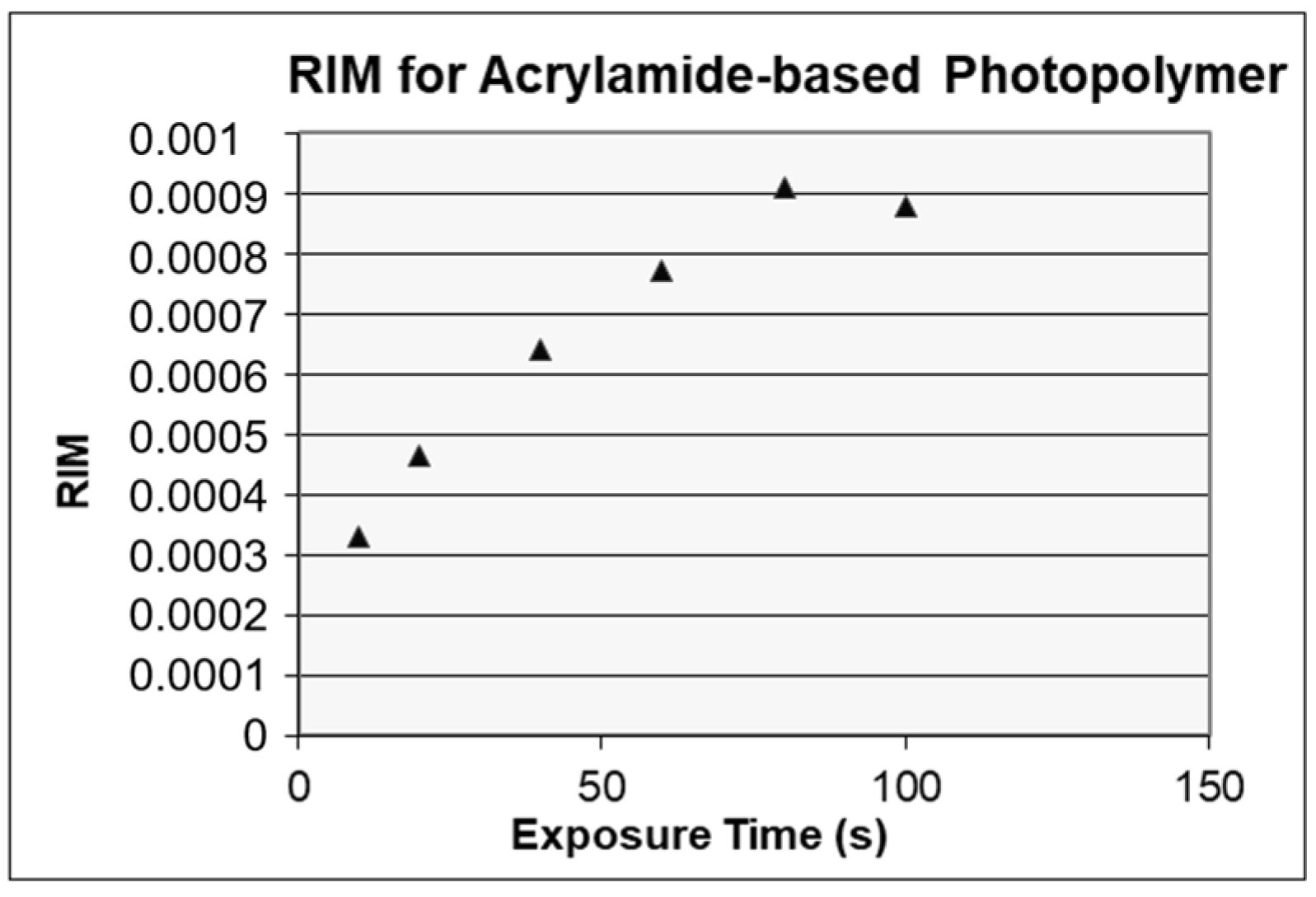 - Blaya, S.; Carretero, L.; Fimia, A.; Mallavia, R.; Madrigal, R.F.; Sastre, R.; Amat-Guerri, F. Optimal composition of an acrylamide and N,N′-methylenebisacrylamide holographic recording material. J. Mod. Opt. 1998, 45, 2573–2584. [Google Scholar] [CrossRef]