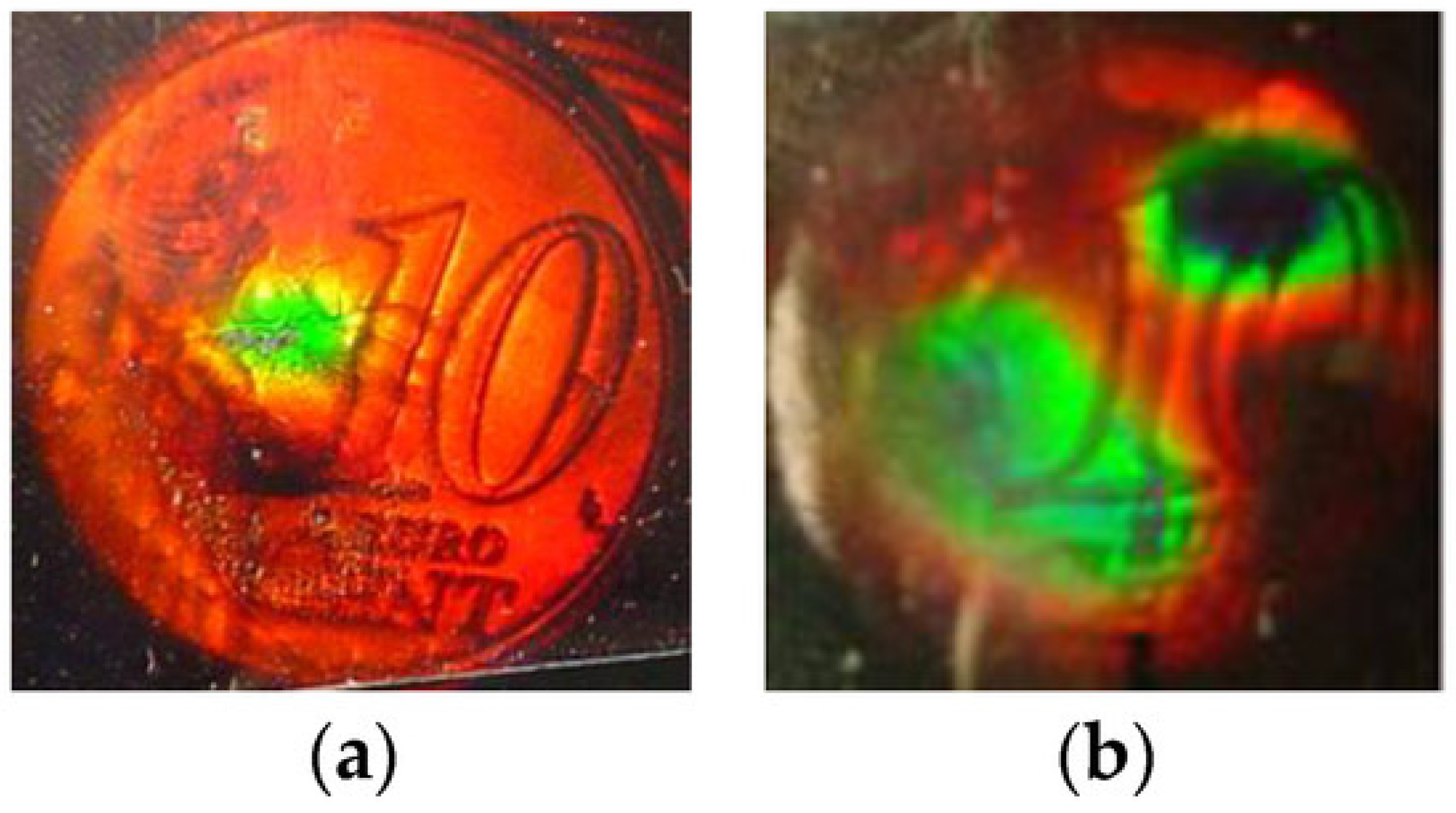 - Vather, D.; Naydenova, I.; Cody, D.; Zawadzka, M.; Martin, S.; Mihaylova, E.; Curran, S.; Duffy, P.; Portillo, J.; Connell, D.; et al. Serialized holography for brand protection and authentication. Appl Opt. 2018, 57, E131–E137. [Google Scholar] [CrossRef] [PubMed]