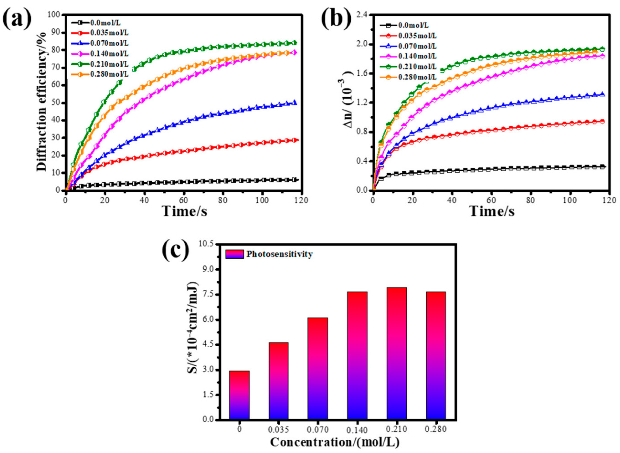- Smirnova, T.N.; Kokhtich, L.M.; Sakhno, O.V.; Stumpe, J. Holographic nanocomposites for recording polymer–nanoparticle periodic structures: I. General approach to choice of components of nanocomposites and their holographic properties. Opt. Spectrosc. 2011, 110, 129–136. [Google Scholar] [CrossRef]