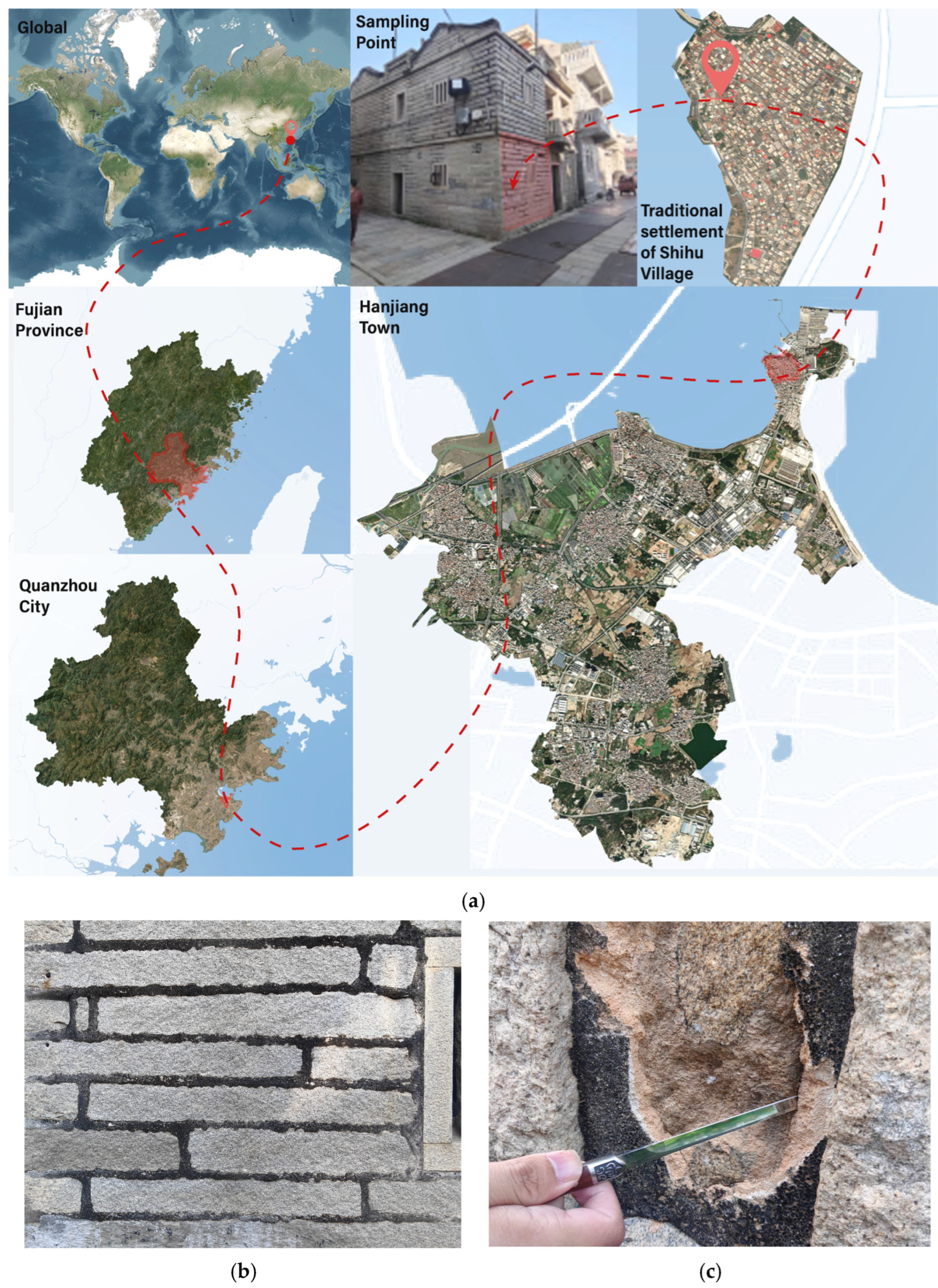 - Lu, H.; Zhang, B.; Hu, Y.; Wang, Z.; Wu, Y.; Ma, Y. A comprehensive analysis of the materials of the ancient Seawall in Hangzhou, China. Eur. Phys. J. Plus 2023, 138, 1072. [Google Scholar] [CrossRef]
