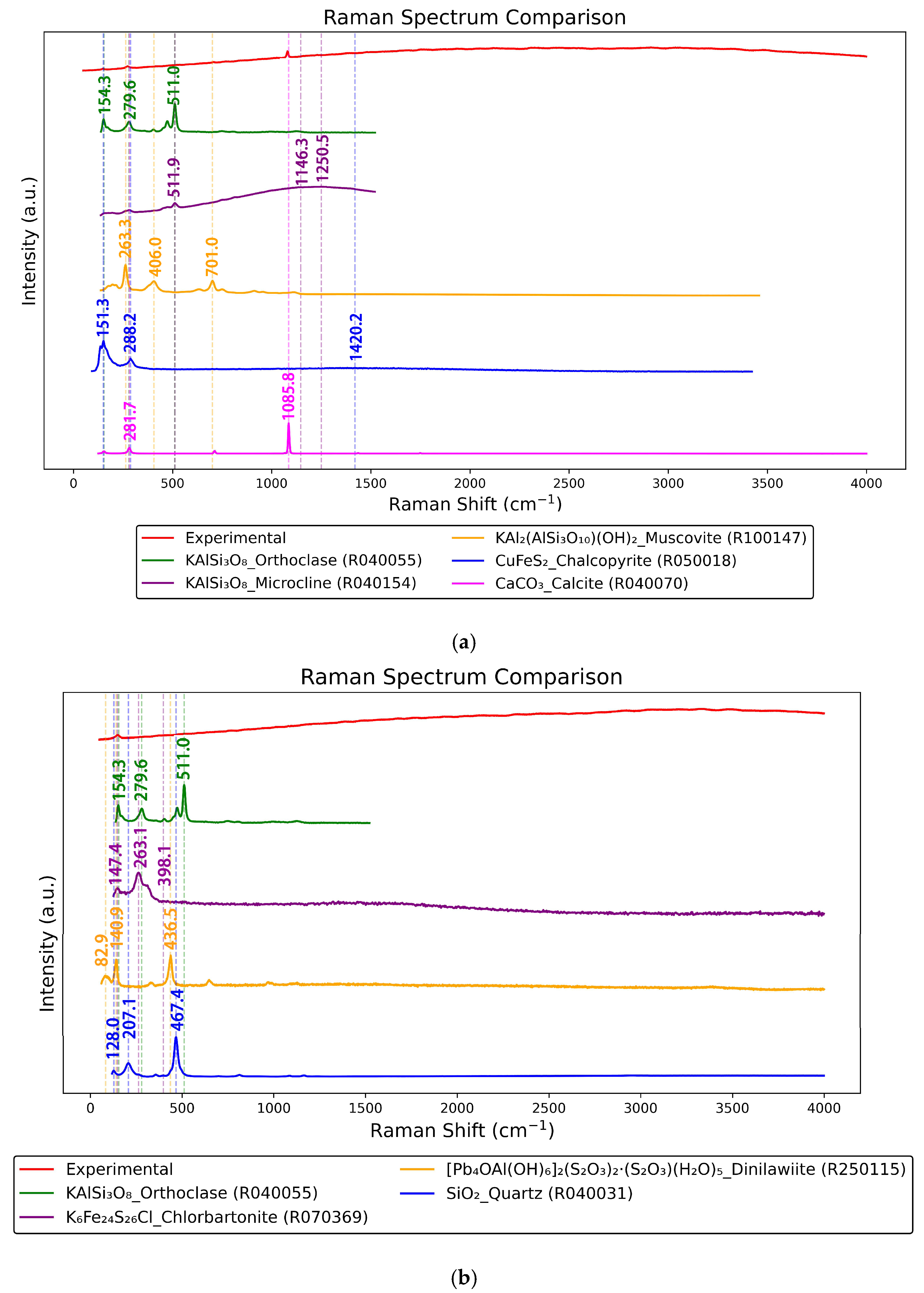 | 2 | Microcline | KAlSi3O8 | 511.9; 1146.3; 1250.5 | / |