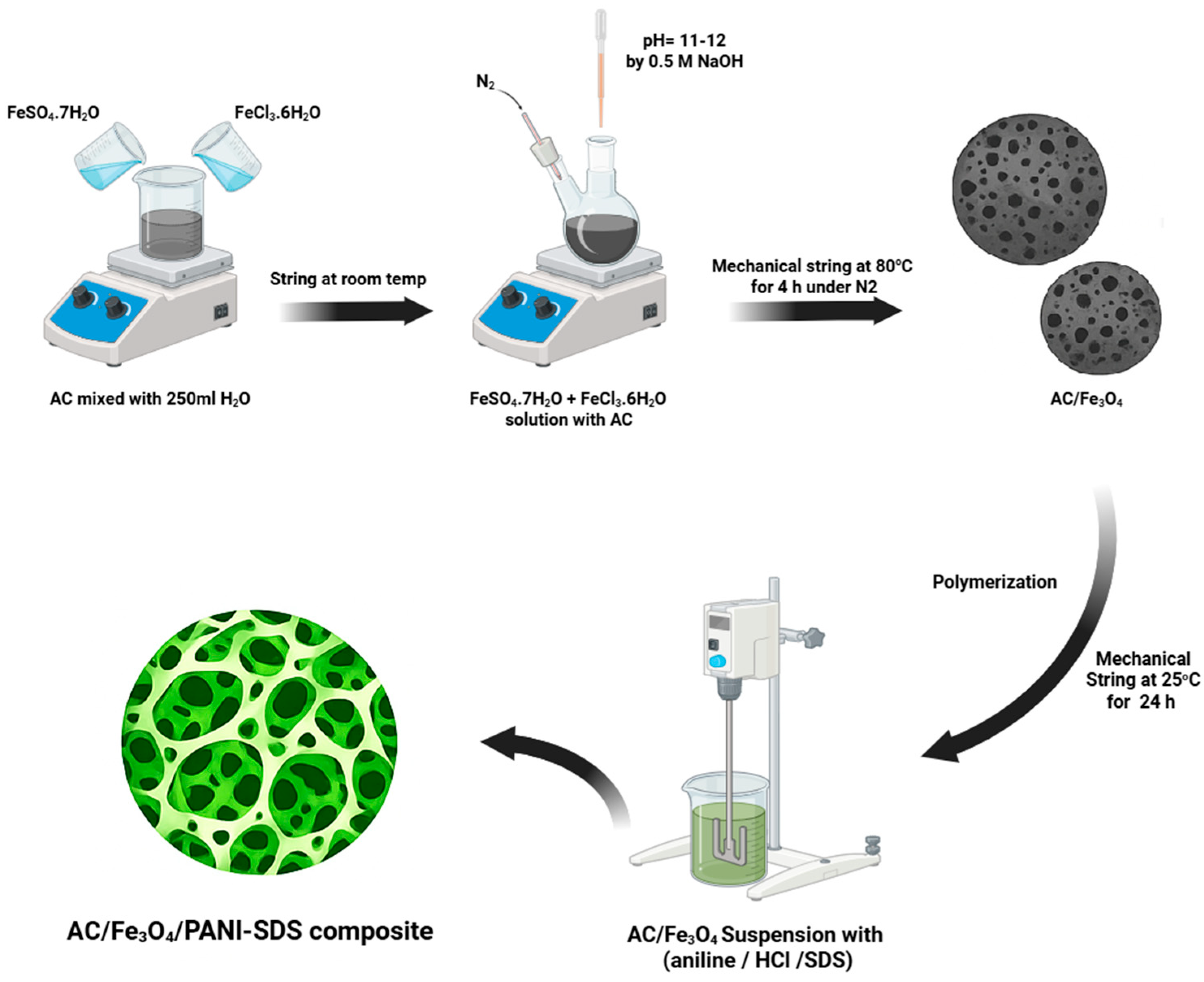 2.1. Synthesizing AC/Fe3O4/PANI-SDS Composite