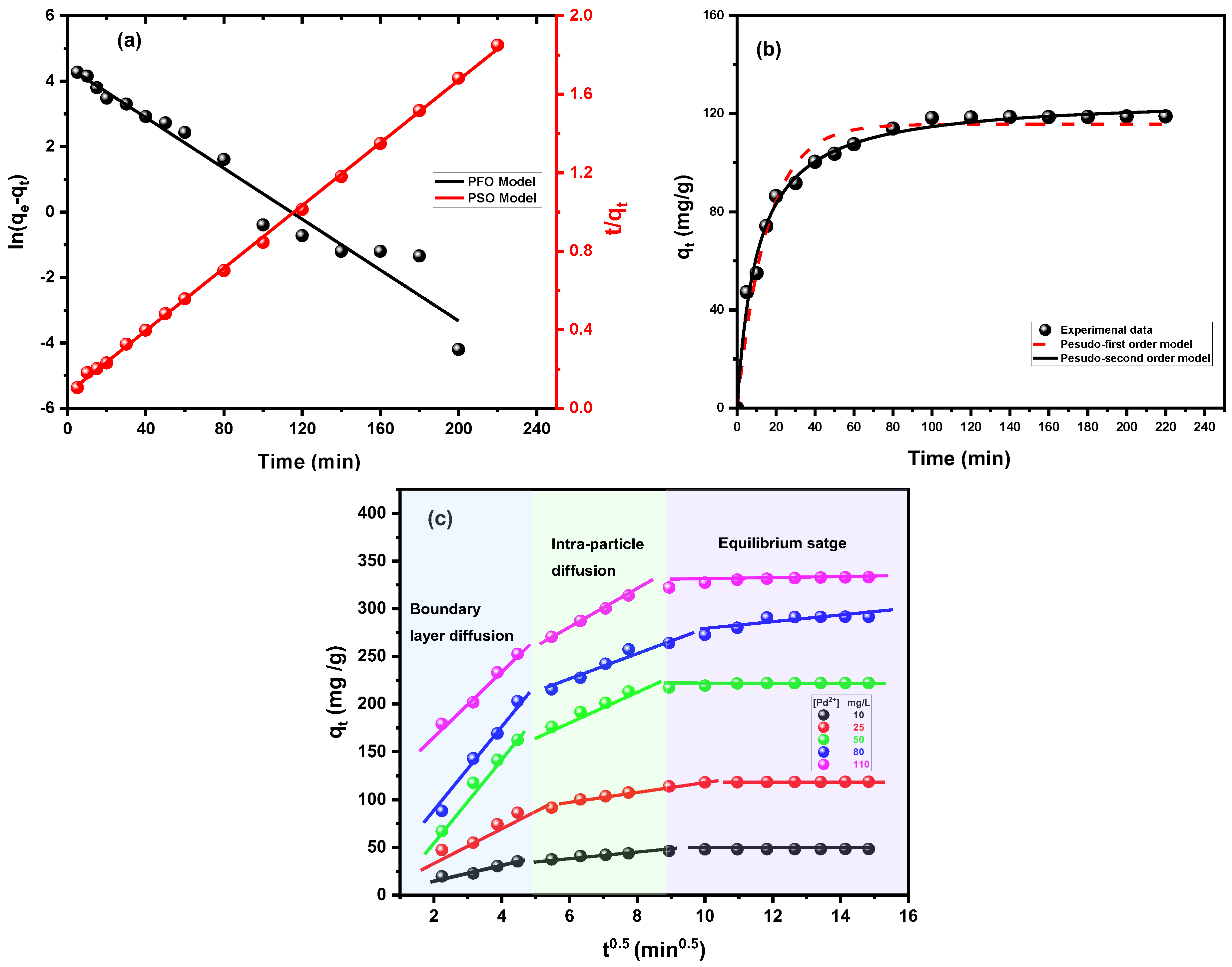 | Pb2+ Ions (mg/L) | Pseudo-First-Order | Pseudo-Second-Order | Intraparticle Diffusion | ||||||||