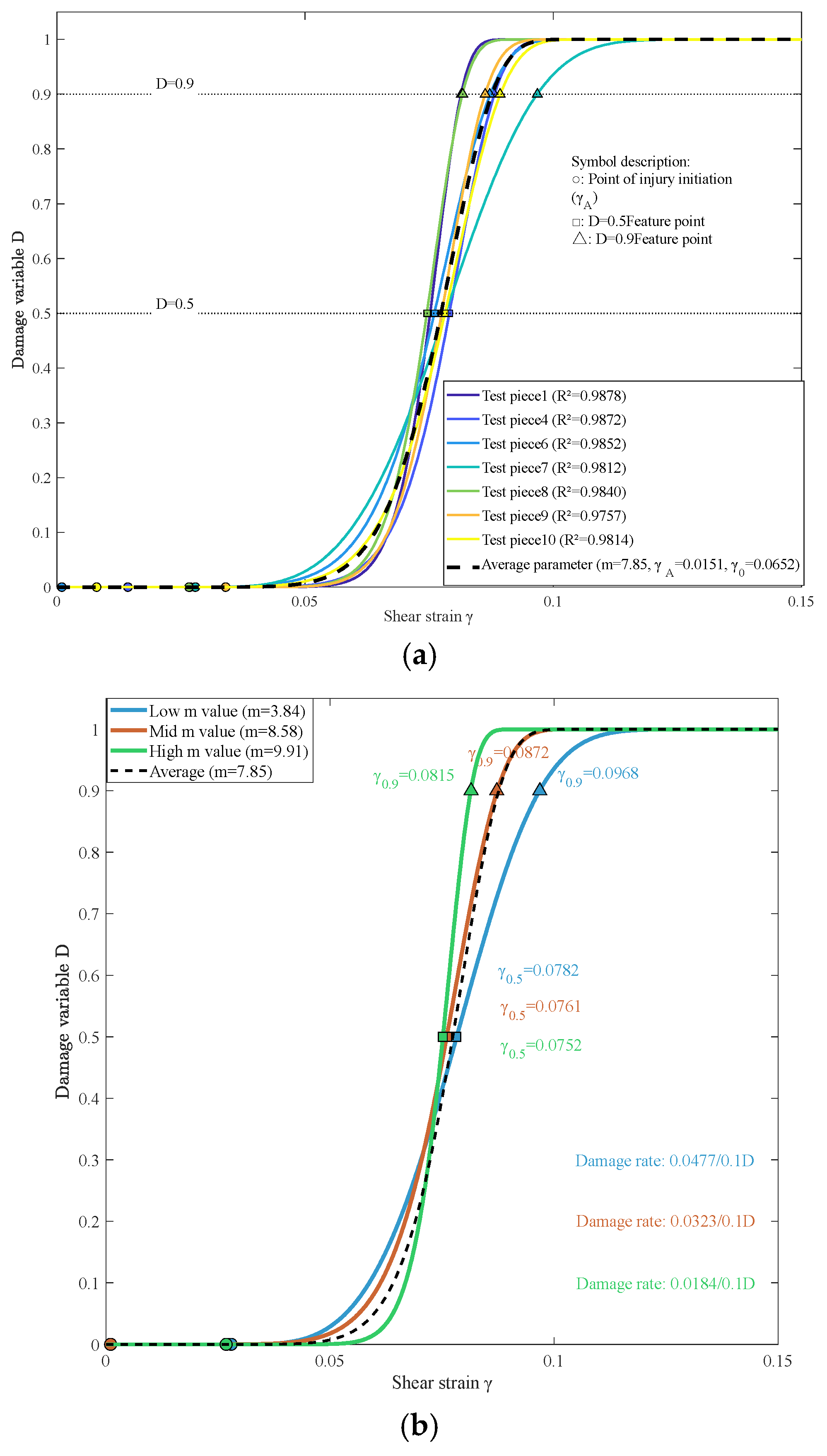- The m-value determines the damage propagation rate: Quantitative calculations of the average damage rate (ΔD/Δγ) during the transition from D = 0.5 to D = 0.9 for different m-values reveal that, from the perspective of damage evolution dynamics, the damage rate is positively correlated with m. This further corroborates the earlier mechanical analysis conclusion that “reducing m can delay interface softening and stiffness degradation”.