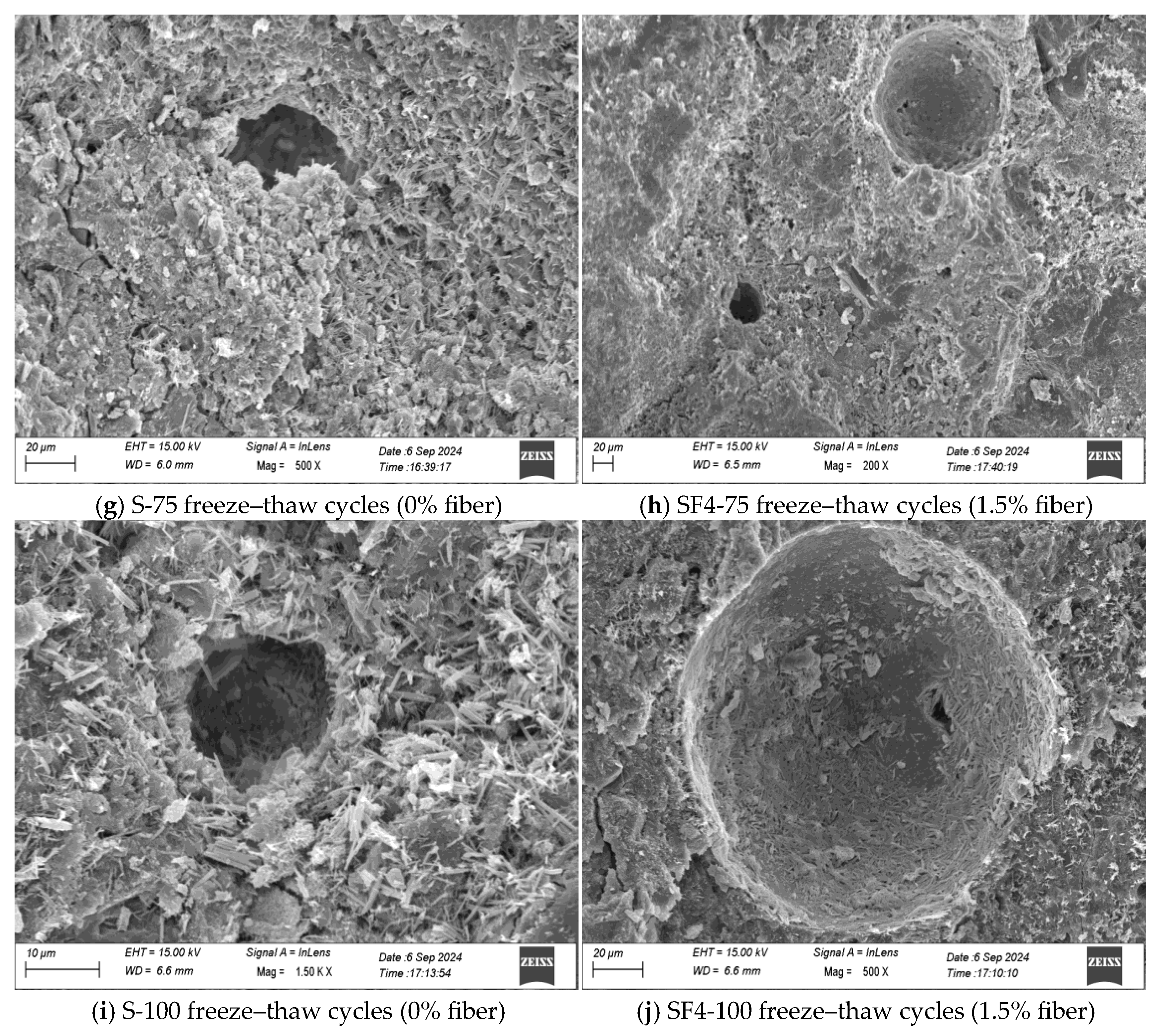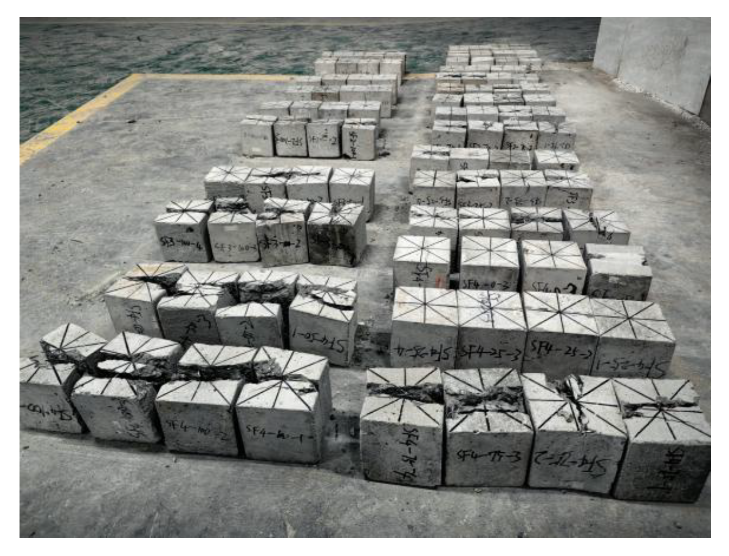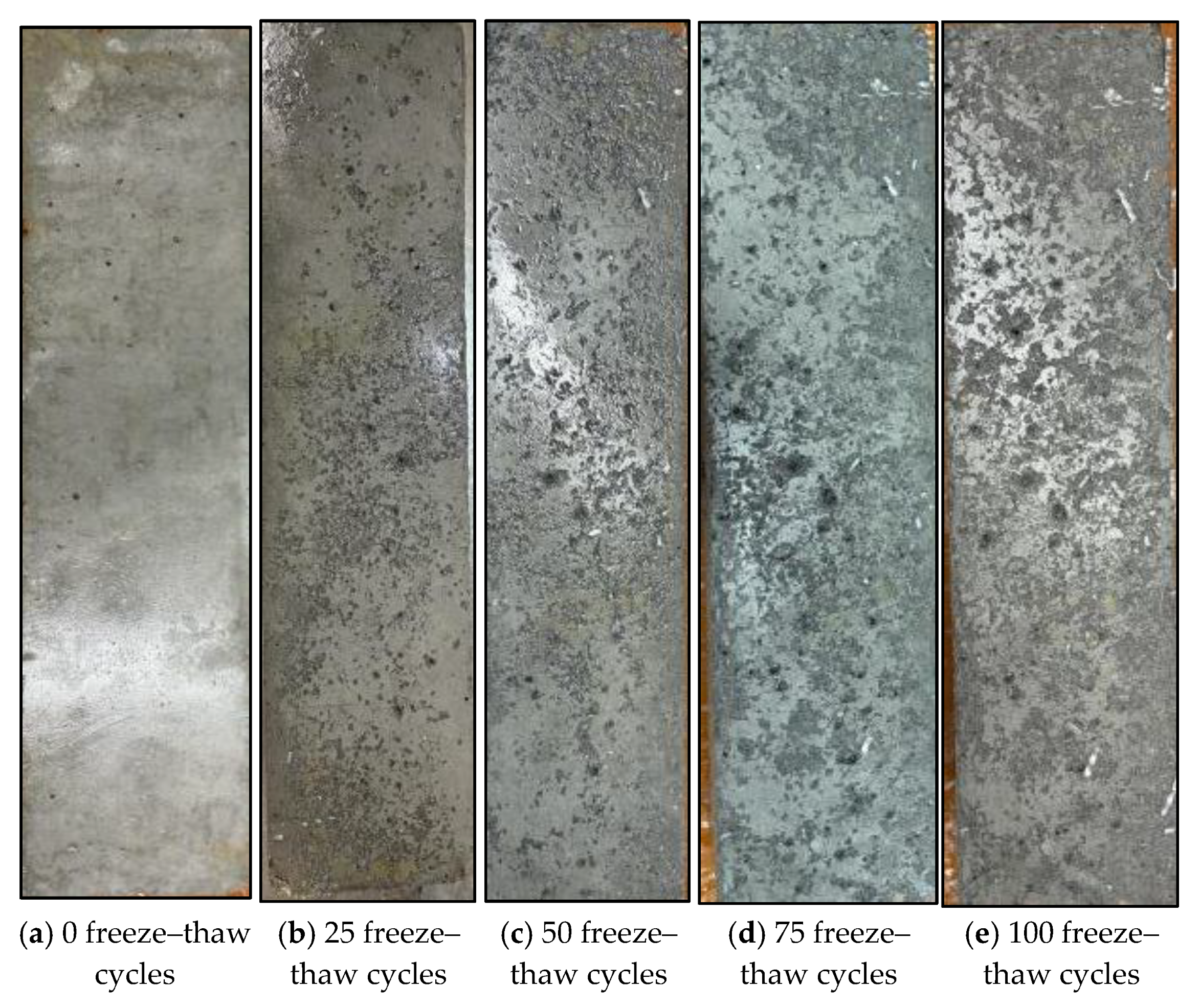 1] conducted freeze–thaw experiments on steel fiber-reinforced concrete (SFRC) with different strength grades, analyzing the effects of strength grade and number of freeze–thaw cycles on compressive strength, mass loss, and microstructure. They established a damage model based on RDEM (Relative Dynamic Modulus of Elasticity). The results indicated that low-strength SFRC exhibited significant damage, with a maximum strength loss of up to 35.02% after 125 freeze–thaw cycles. In contrast, high-strength SFRC maintained better performance and a denser microstructure. Sun et al. [