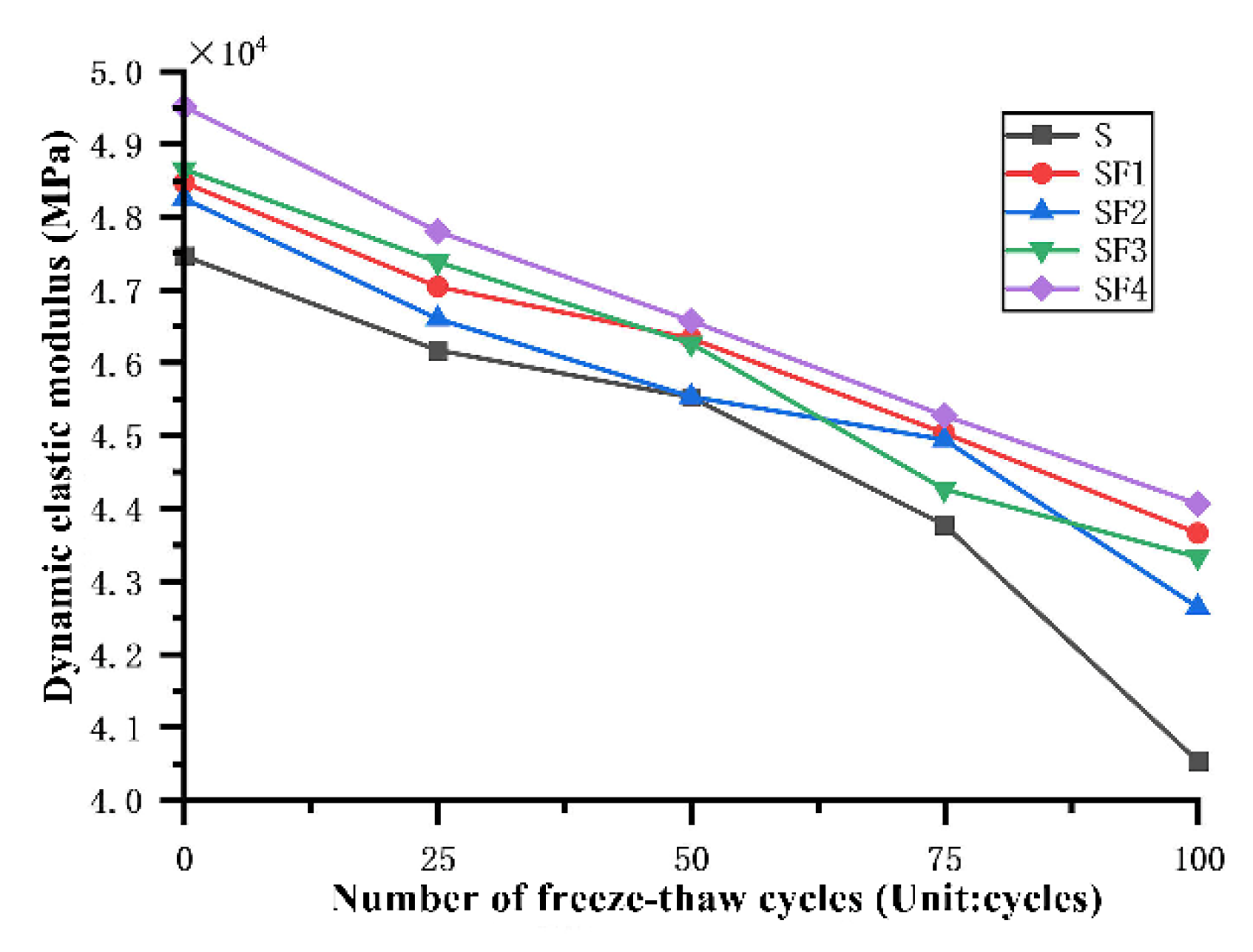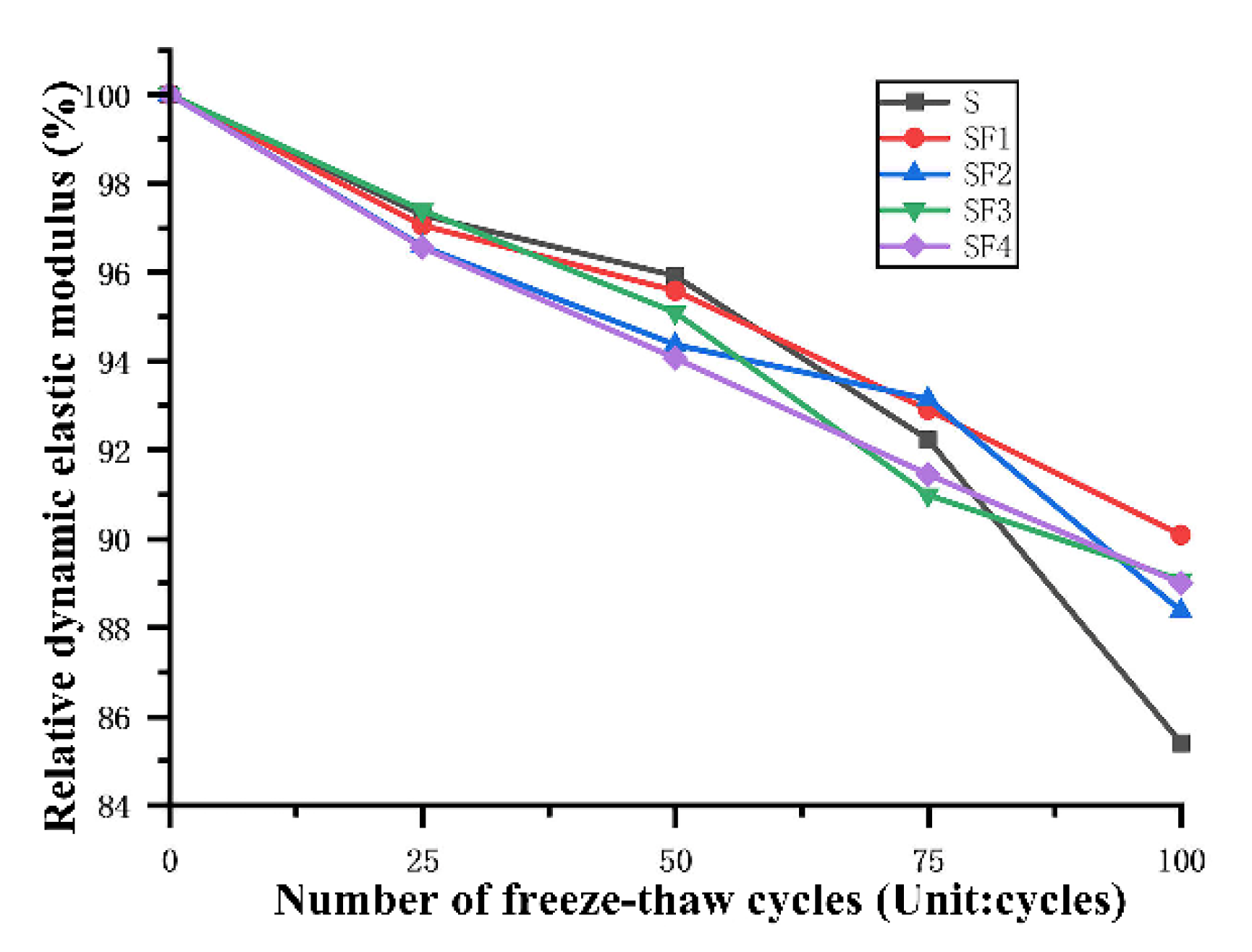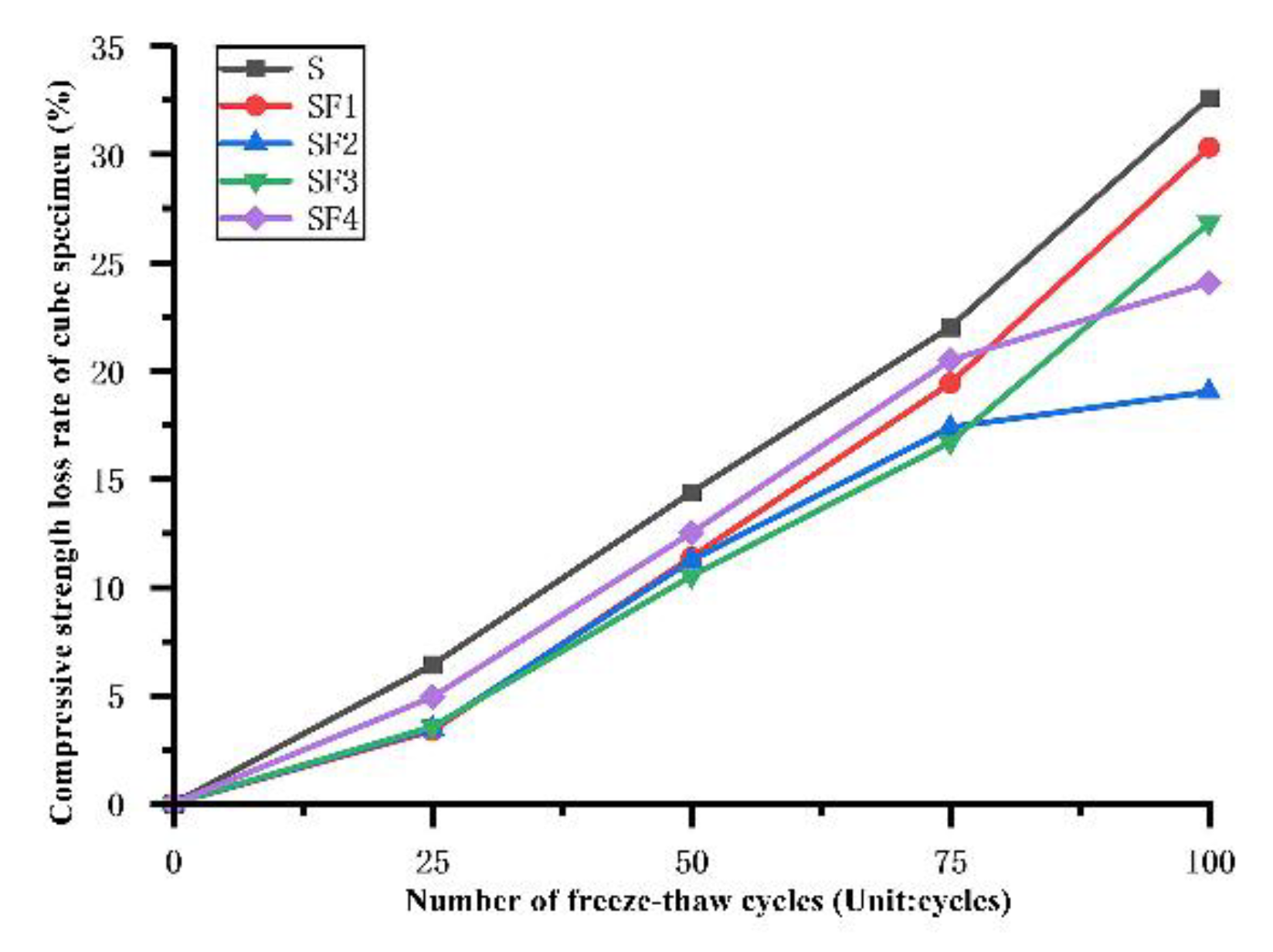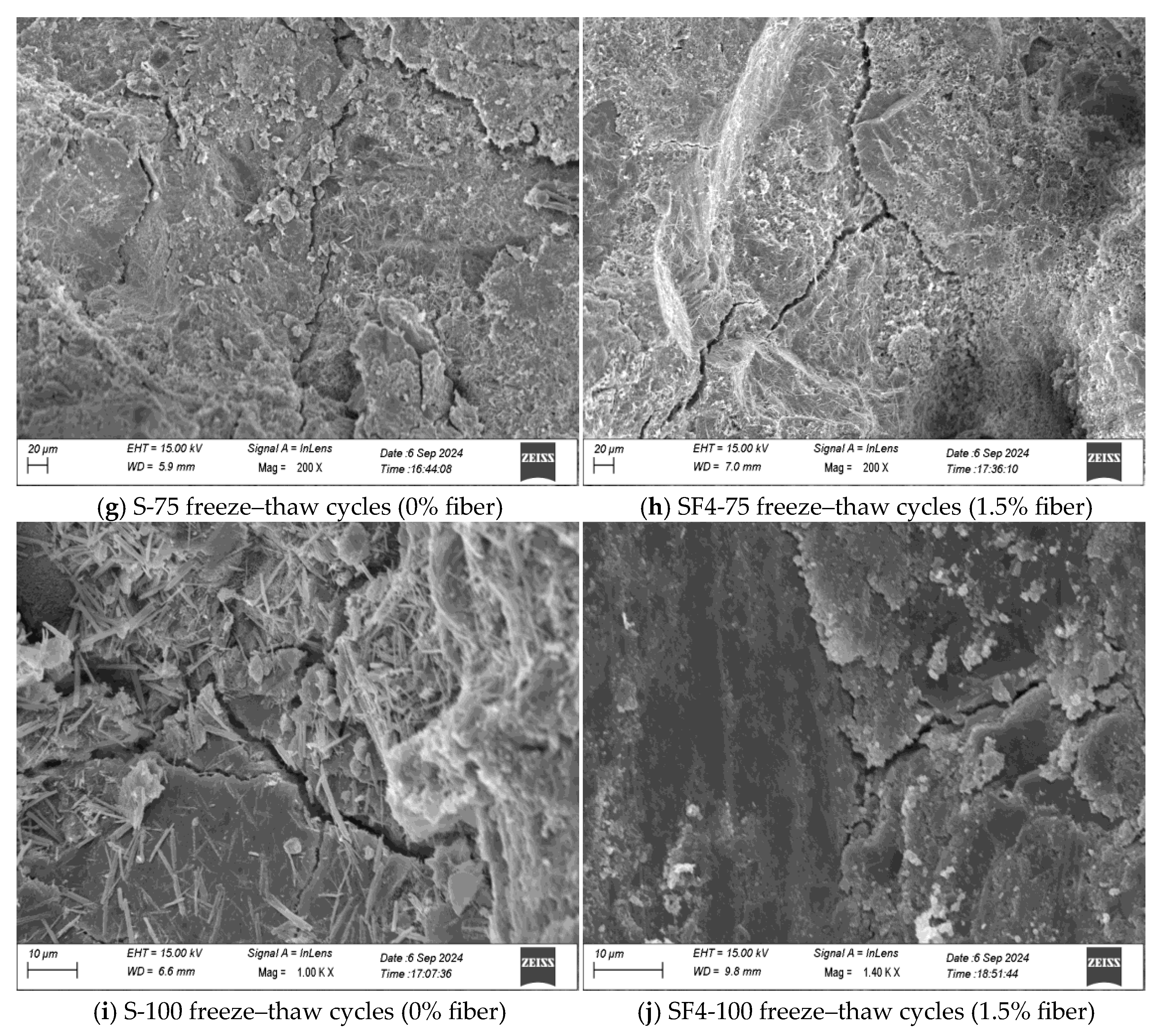 1] conducted freeze–thaw experiments on steel fiber-reinforced concrete (SFRC) with different strength grades, analyzing the effects of strength grade and number of freeze–thaw cycles on compressive strength, mass loss, and microstructure. They established a damage model based on RDEM (Relative Dynamic Modulus of Elasticity). The results indicated that low-strength SFRC exhibited significant damage, with a maximum strength loss of up to 35.02% after 125 freeze–thaw cycles. In contrast, high-strength SFRC maintained better performance and a denser microstructure. Sun et al. [