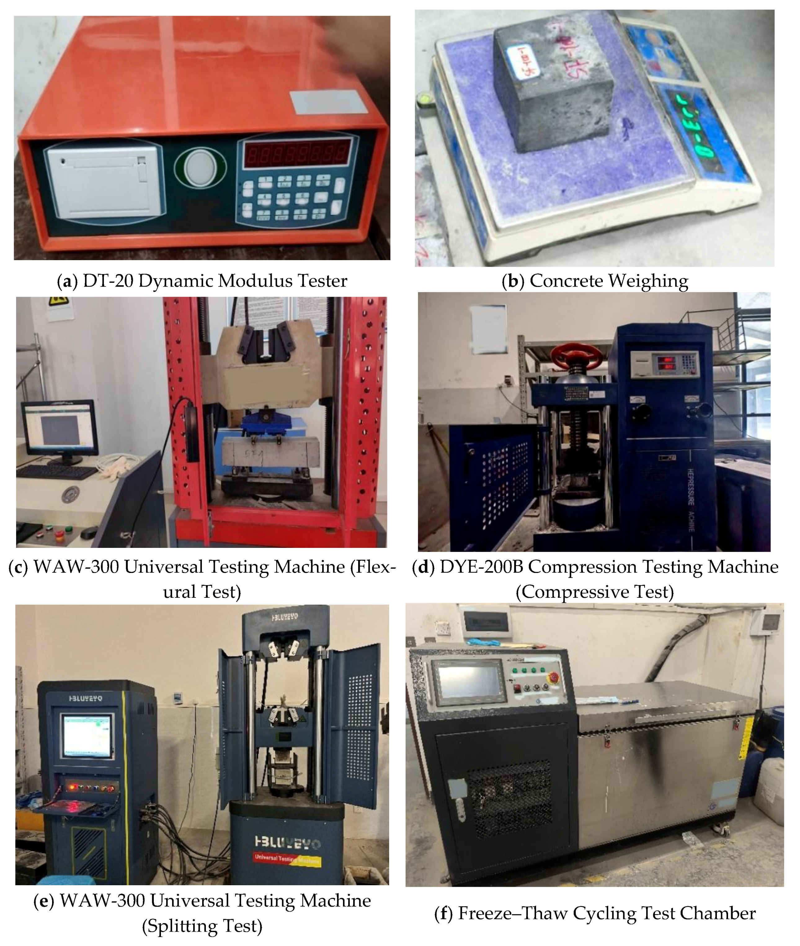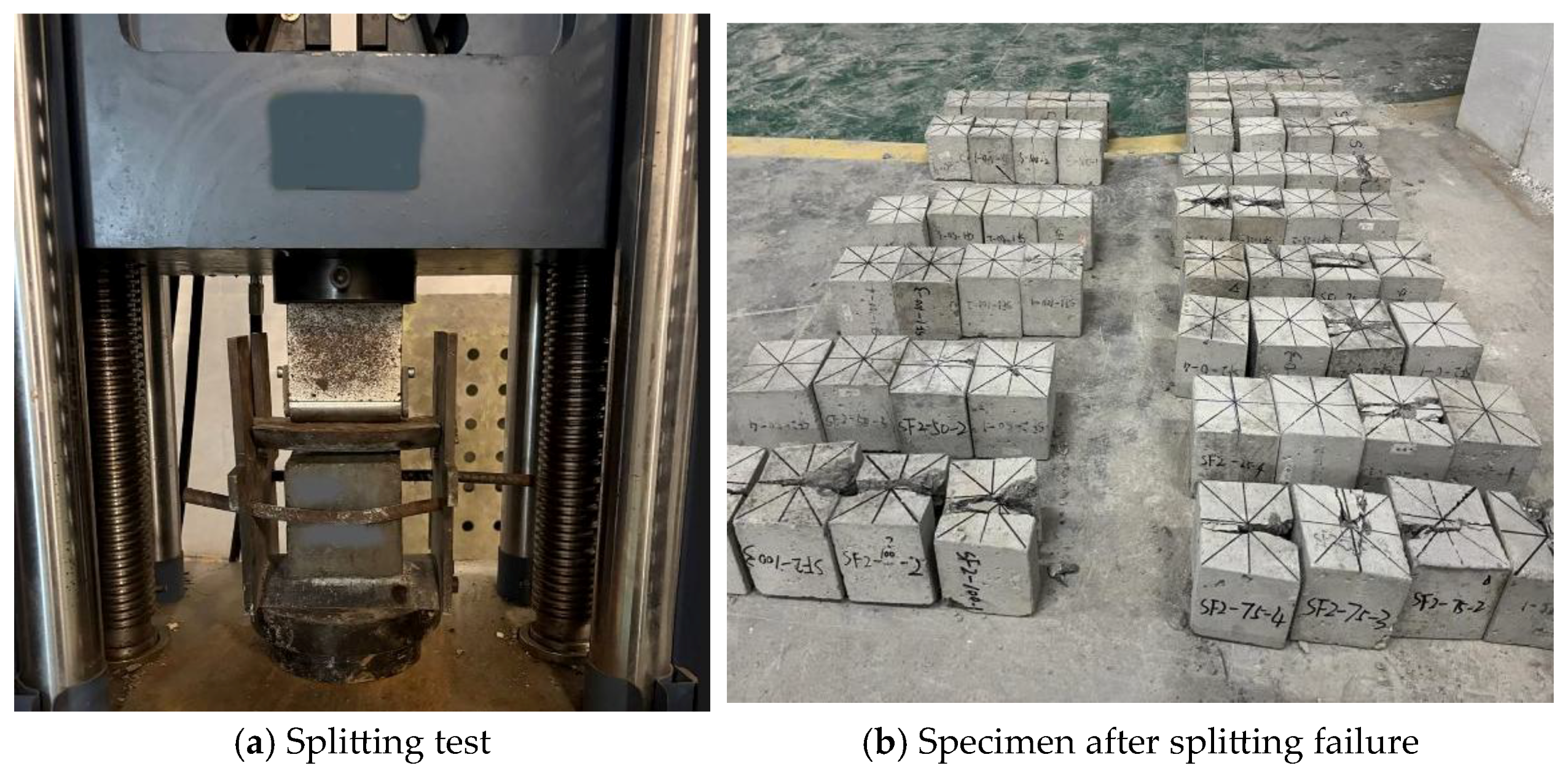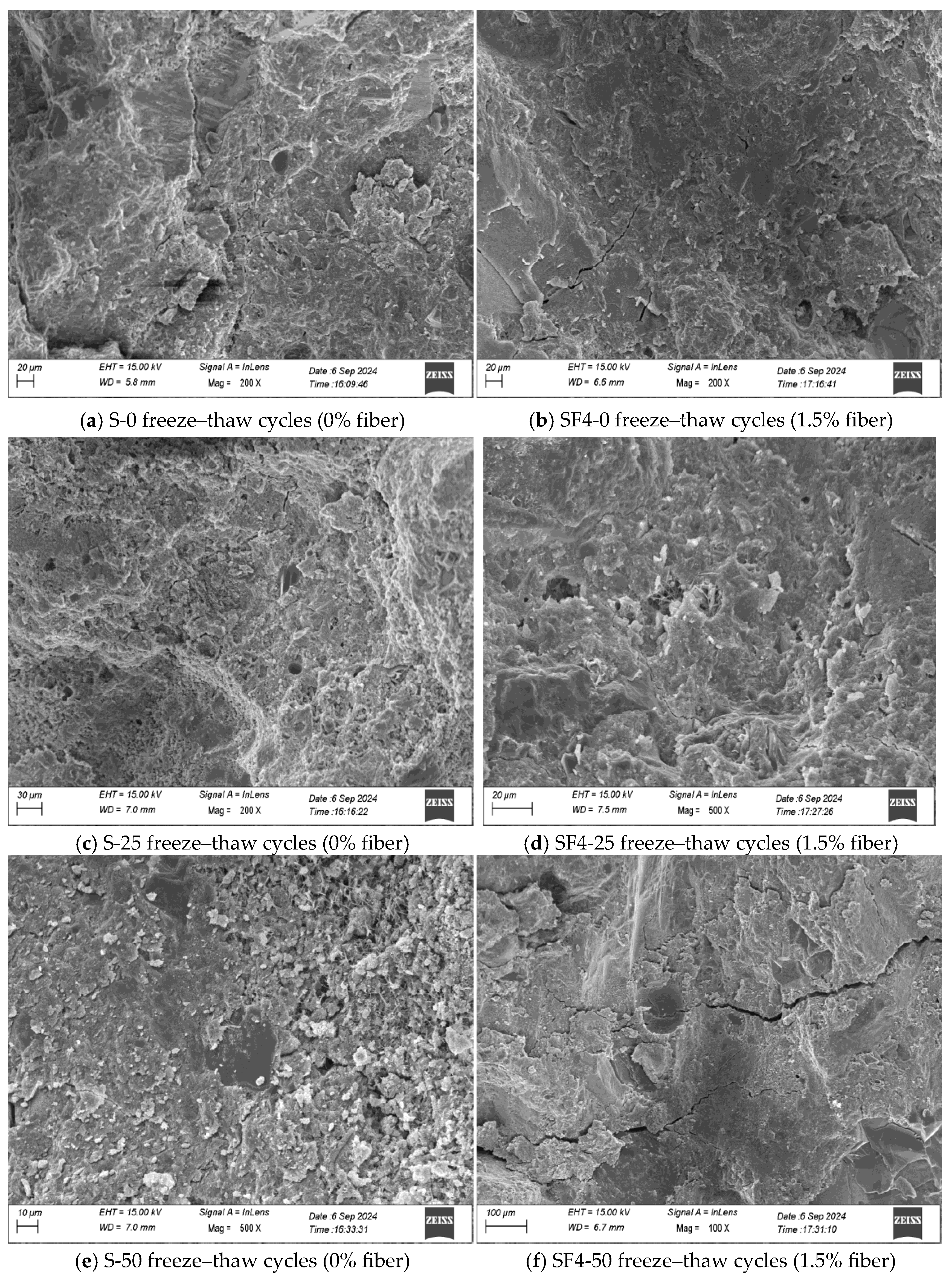6] studied the effects of freeze–thaw cycles and steel fiber content on the dynamic mechanical properties of concrete through experiments and SEM analysis. The results showed that freeze–thaw cycles lead to a reduction in axial compressive strength and an increase in peak strain; a 1% steel fiber content can significantly improve the dynamic performance and energy absorption capacity of concrete after freeze–thaw deterioration. Bai et al. [