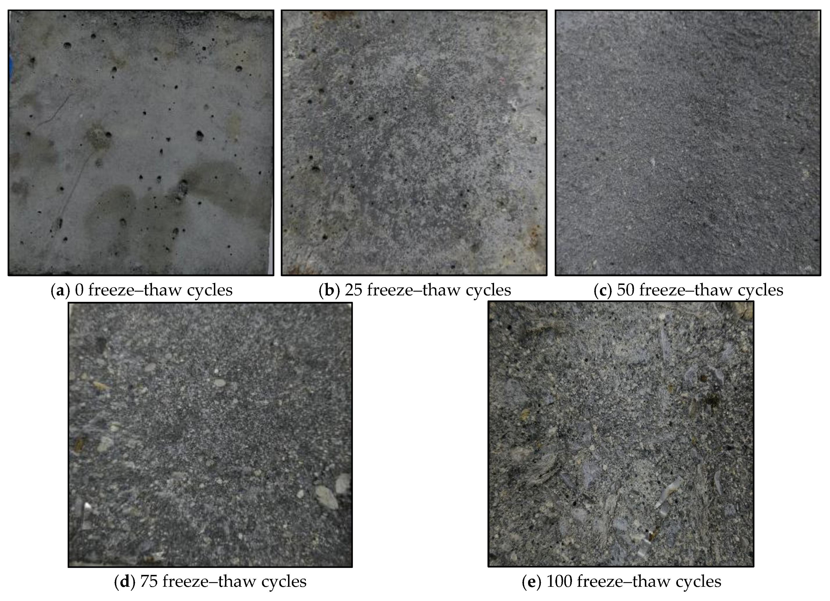 9] investigated the influence of freeze–thaw cycles on the thermophysical and mechanical properties of concrete, analyzed the mechanisms of multiple factors such as water–binder ratio and air content, summarized the evolution of microstructure, damage theories, and assessment methods, and provided suggestions for future research on multiscale modeling and damage mechanisms under complex environmental conditions.