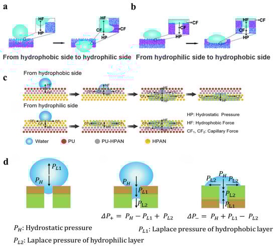 Generally, Janus membranes consist of a hydrophobic layer, which is resistant to liquids, and a hydrophilic layer, which is attractive to liquids. The Janus membrane displays contrasting wettability on its two sides, but generally the wettability is the same for the same side of the membrane, and the wettability gradient along the cross-section of the membrane changes (unidirectional transport of liquids is driven by the cross-section wettability gradient), and the directional transport is manifested as movement in the cross-section direction. Directional transport manifests itself inside the Janus membrane as movement in the cross-sectional direction. The directional transport mechanism of liquids across Janus membranes remains unclear despite the observable transport behavior on both sides [43]. Wu et al. [19] fabricated hydrophilic/hydrophobic Janus membranes using hydrophilic cross-linked Polyvinyl Alcohol (c-PVA) and hydrophobic PU, and analyzed and investigated the mechanism of unidirectional water transport. When the hydrophobic layer faces upward, and water droplets accumulate on its surface, the droplets experience two opposing forces: an upward hydrophobic force (HF) from the hydrophobic layer and a downward hydrostatic pressure force (HP). Initially, these two forces remain in equilibrium, preventing water penetration through the hydrophobic layer. However, continuous water accumulation increases HP, eventually causing HP to exceed HF. The porous nature of the hydrophobic layer enables water infiltration under resultant force. When water comes into contact with the underlying hydrophilic layer, it generates a novel lateral capillary force (CF) that drives liquid transport through both the hydrophilic layer and across the Janus membrane (Figure 2a,b). This completes the water penetration process through the Janus membrane. When the hydrophilic layer is upward, water will enter the inside of the layer under the action of CF, and the combined force of CF and HP will cause the water to transfer downward until it touches the hydrophobic layer. At this point, the upward force HF counteracts the downward combined force (CF+HP). As water attempts to permeate vertically through the entire membrane, the HF prevents the water from penetrating, and this HF is also called the “breakthrough pressure (F breakthrough).” If the water droplets continue to grow, the hydrostatic pressure will continue to increase so that the combined force of the water downward is greater than the F breakthrough, resulting in the water penetrating the Janus membrane, which indicates that there is an upper limit to the amount of the membrane that can prevent water from infiltrating in the Counter-flow infiltration blocking. The maximum water column height can be expressed as F breakthrough, then F breakthrough can be expressed as