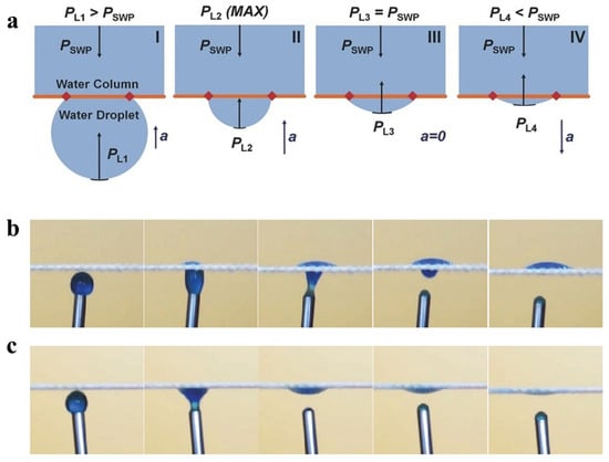 (a) Schematic illustration of the four stages of antigravity water transport by a superhydrophobic “pump”: (I) Initial PL1 > PSWP causes the droplet to rise; (II) PL reaches a maximum value of PL2 and then begins to decrease; (III) PL decreases to equal PSWP; (IV) PL continues to decrease to less than PSWP, and the droplet begins to decelerate [13]. Copyright 2015, Wiley. (b,c) Schematic diagrams of antigravity osmosis of water droplets, (b) hydrophobic layer underneath (at 0.26 s interval) and (c) hydrophilic layer underneath (at 0.18 s interval) [47]. Copyright 2013, Scientific Reports.