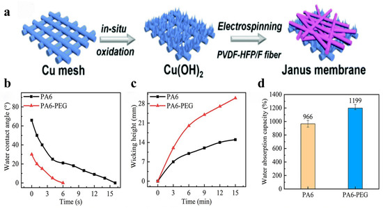 (a) Fabrication of Janus membranes by oxidation and co-spinning [56]. Copyright 2021, RSC. (b–d) Comparison of contact angle, core suction height, and water absorption of PA6 and PA6-PEG membranes [51]. Copyright 2021, ACS.