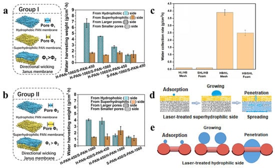Through Young’s Laplace equation, the magnitude of the resistance is inversely proportional to the pore size of the hydrophobic layer, and the magnitude of the capillary force is also inversely proportional to the pore size of the hydrophilic layer [53,54]. A large hydrophobic layer pore size and a small hydrophilic layer pore size will favor the directional transport of water. Wu et al. [61] compared the water collection rates of two membranes, the macroporous hydrophobic/microporous hydrophilic Janus membrane and the microporous hydrophobic/macroporous hydrophilic Janus membrane, and ultimately found that the membrane with the macroporous hydrophobic/microporous hydrophilic layer transported water faster, and the directional core-suction capacity was 1.7 times greater (Figure 5a,b).