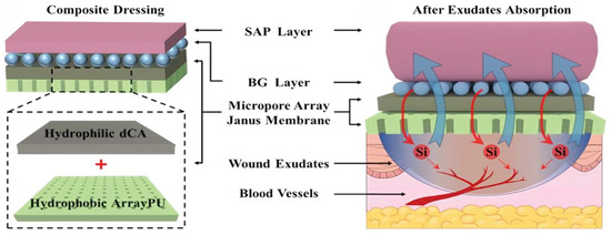 In addition to unidirectional drainage of cellular exudates, the Janus membrane’s properties can be optimized to achieve bidirectional selective transport, thereby establishing a more precise liquid permeation mechanism. Bao et al. [66] designed a special membrane with controlled bi-directional water transport by electrostatic spinning using a hydrophobic PU layer with microporous arrays and a hydrophilic deacetyl cellulose acetate (dCA) layer to form a bilayer of the Janus membrane, and then a triple-layer Janus membrane was formed by placing silicate bioglass (BG) particles with a BG-SAP bioactive layer consisting of sodium polyacrylate water-absorbent particles (SAP) (Figure 6). The modified Janus membrane is capable of pumping a large amount of biofluid while allowing a small amount of fluid to flow back, which carries microscopic particles conducive to wound healing, and the top layer of SAP is capable of absorbing excessive biofluid, which can solve the problem of excessive wound exudate. This study improved the unidirectional water drainage performance of conventional Janus membranes. The enhanced water absorption capacity and selective liquid anti-reflux property can effectively tackle the problems accompanied by chronic wounds, such as diabetic ulcers, including excessive exudate and poor angiogenesis.