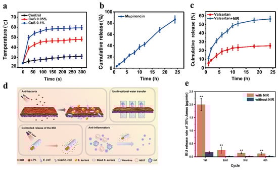 (a) Heating curves of fibrous membranes with different CuS contents at a power density of 1.0 W/cm2. (b) Cumulative release of mupirocin from Janus membranes and (c) cumulative release of valsartan from Janus membranes with and without NIR light irradiation [34]. Copyright 2023, Elsevier. (d) Schematic diagram of multifunctional composite Janus nanofibrous membrane. (e) Drug release amounts of Janus membranes in four irradiation cycles with and without light irradiation. ** p < 0.01 indicates an extremely significant difference compared to the control group. [78]. Copyright 2023, ACS.