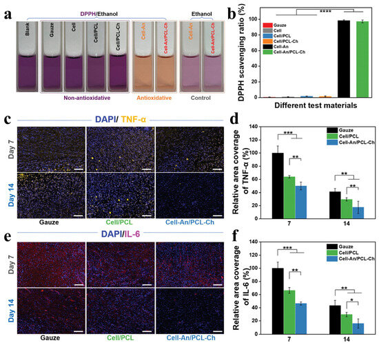 (a) Co-culture of different dressings with DPPH. (b) DPPH scavenging efficiency of each dressing after 30 min. (c) Fluorescence staining of TNF-α in regenerated tissues. (d) The coverage area of TNF-α. (e) Fluorescence staining of IL-6 in regenerated tissues on days 7 and 14. (f) The coverage area of IL-6. p values for two tailed tests: * <0.05, ** <0.01, *** <0.001, **** <0.0001 [84]. Copyright 2023, Wiley.