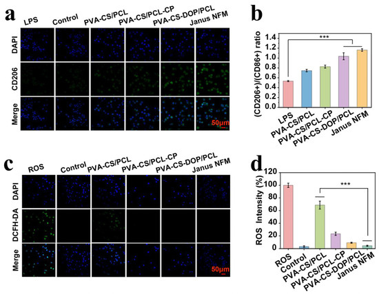 Xiao et al. [85] imparted antioxidant activity by loading Dendrobium officinale polysaccharide (DOP) into the hydrophilic layer, which scavenged reactive oxygen species (ROS) while inducing the transformation of pro-inflammatory M1 macrophages into anti-inflammatory M2 macrophages. Immunofluorescence staining observations (Figure 9a) and M2/M1 ratio analysis (Figure 9b) revealed that the DOP-loaded Janus fibrous membrane significantly promoted the polarization of macrophages toward the anti-inflammatory M2 phenotype, where green fluorescence represented M2 macrophages. It can be observed that the Janus NFM group exhibited the highest content of M2 macrophages. Furthermore, the presence of DOP effectively reduced the intracellular ROS level under inflammatory conditions (Figure 9c,d), with green fluorescence indicating the intracellular ROS content. These results demonstrated that the Janus membrane exerted anti-inflammatory activity through dual pathways of immunomodulation and antioxidation.
