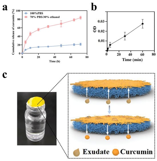 (a) Release curve of curcumin from Janus membranes in a simulated wound in vitro environment. (b) OD values of the in vitro solution measured by UV–Vis spectrophotometer. (c) In vitro model for testing the downward release of curcumin from Janus membranes [86]. Copyright 2022, Wiley.