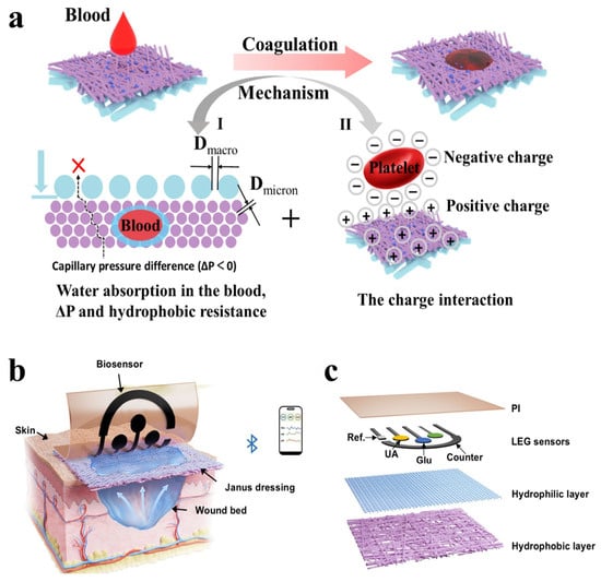 (a) Coagulation mechanism of PVA/TPU composite Janus membrane loaded with CS and Ag nanoparticles [91]. Copyright 2023, Springer Nature. (b) Schematic diagram of Janus-structured electronic dressing with detectable biofluids for use in wounds and (c) disassembly diagram of Janus-structured electronic dressing [94]. Copyright 2025, ACS.
