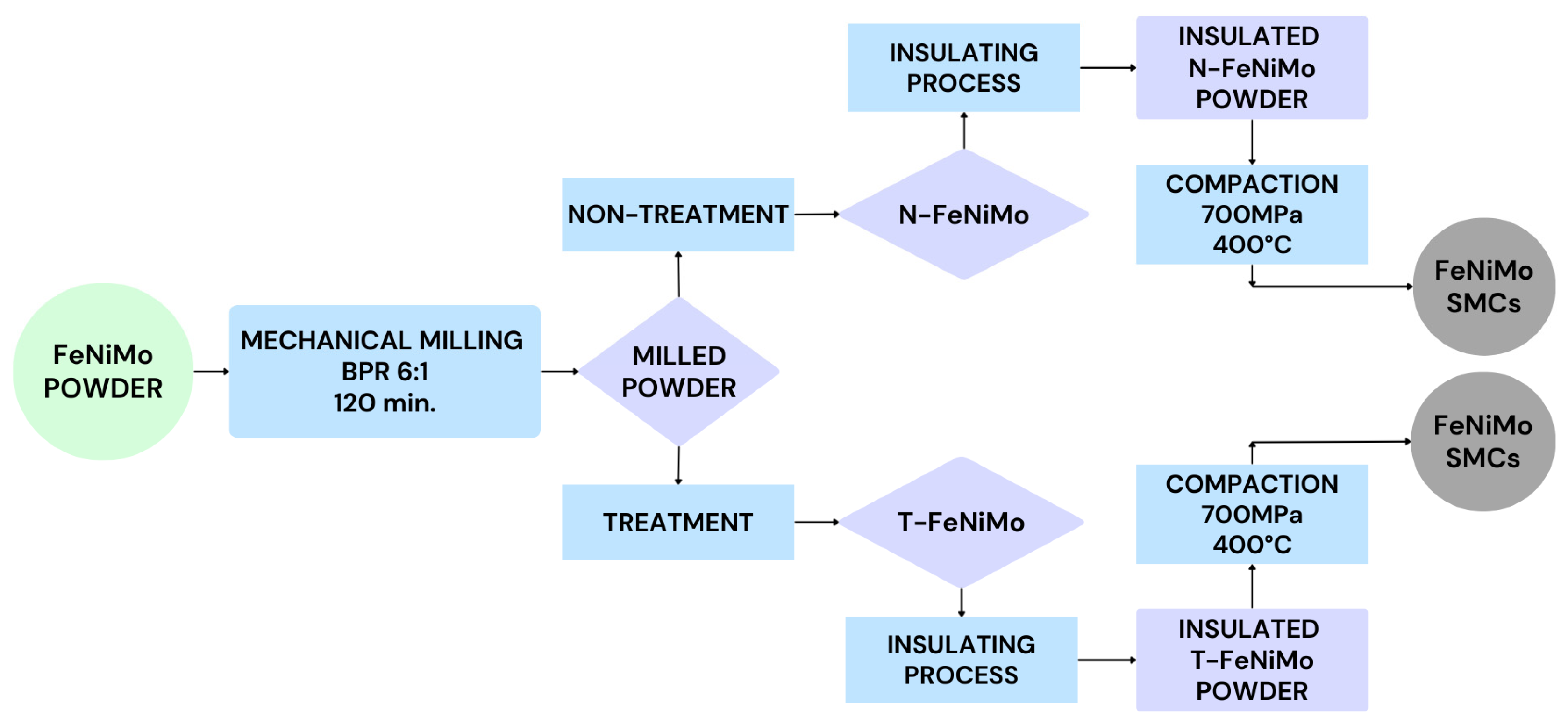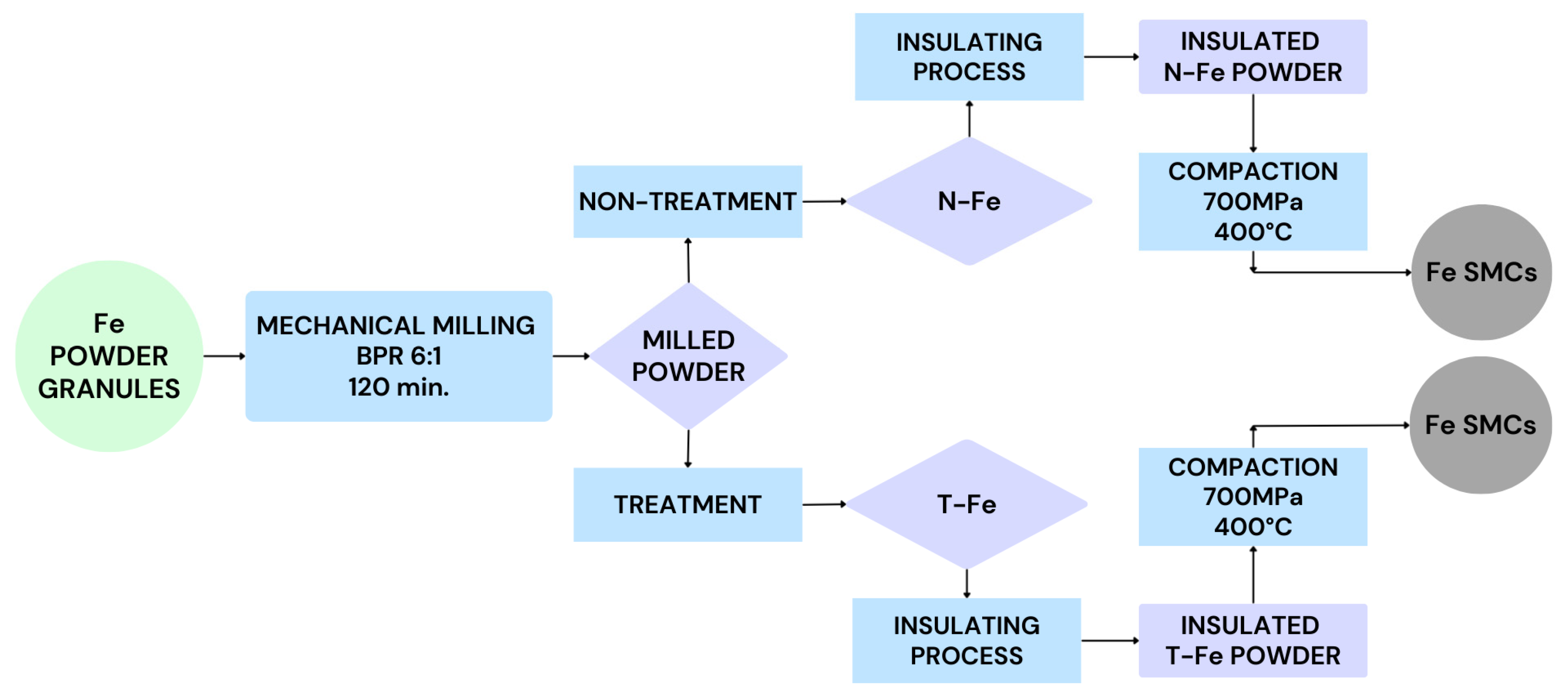 - Improved insulation continuity is expected to have a beneficial effect on frequency-dependent energy losses; however, this assumption is based on indirect magnetic indicators and will be verified by dedicated AC core loss measurements in future work. Improved insulation continuity is expected to have a beneficial effect on frequency-dependent energy losses; however, this assumption is based on indirect magnetic indicators, and a direct evaluation of AC core losses is beyond the scope of the present study. A detailed analysis of AC core losses and their correlation with powder surface treatment and compaction conditions will be the subject of a forthcoming publication.