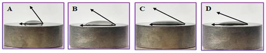 The results of the wettability testing of (A) the non-coated CpTi discs (65°), (B) the 4 h (50°), (C) 6 h (45°), and (D) 8 h (40°) TaON-coated CpTi discs.