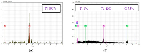 As seen in Figure 4B, the TaON-coated CpTi discs showed the presence of two Ta peaks (lα 8.146 and mα 1.712), two Ti peaks in the alpha phase (kα 4.512 and lα 0.452), one N peak (kα 0.392), and one O peak (kα 0.525). The elemental composition of the non-coated CpTi disc included 100% Ti (Figure 4A), while the TaON-coated CpTi discs showed the following elemental composition: Ta—40%, Ti—1%, N—23%, and O—35% (Figure 4B).